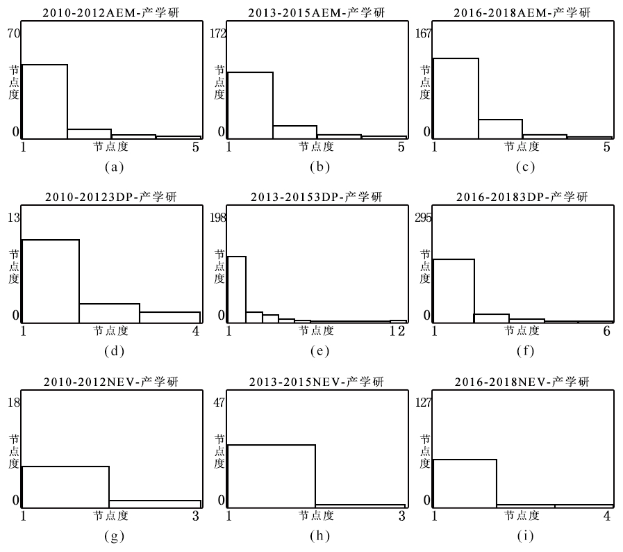 由图5(a)~(c)可知,2010—2018年AEM产业的产学研协同创新网络节点度次数分组结构一致,网络整体涌现出核心—边缘结构,但结构演化并不稳定。虽然AEM产业的产学研协同创新网络边数不断增多(见表4),节点规模却呈倒U型增幅变化。同样,虽然3DP产业的产学研协同创新网络节点规模不断扩大、边数不断增多,但图5(d)~(f)所示的2010—2018年3DP产业产学研协同创新网络节点度次数分组结构却呈倒U型变化。表明网络整体核心—边缘结构演化不稳定。由图5(g)~(i)可知,2010—2015年NEV产业的产学研协同创新网络节点度次数分组结构一致,节点规模不断扩大、边数不断增多,表明网络呈现稳定增长的核心—边缘结构;虽然2016—2018年节点规模不断扩大、边数不断增多,但网络节点度次数分组却呈增加趋势,表明网络异质性增强,网络整体核心—边缘结构向松散方向演化。同时,由前文分析可知,2010—2018年3DP、AEM产业的产学研协同创新网络均处于低协同度,NEV产业在2010—2015年处于高协同度、2016—2018年处于低协同度。这是因为,企业与学研机构间协同创新过程中,由于社会角色、文化差异及利益目标不一致,导致企业与学研机构间产生一定网络主导权争议,而这种争议会影响体现网络权力分布的网络整体核心—边缘结构稳定。可见,产学研协同创新网络核心—边缘结构演化的不稳定性与低协同度具有一定正相关关系。