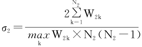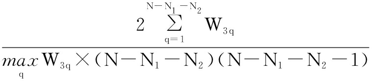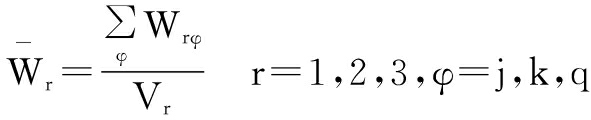 设战略性新兴产业协同创新“网络的网络”中V1、V2、V3连边的权重集合分别为W1={W1j|j=1,…,N1}, W2={W2k|k=1,…,N2},W3={W3q|q=1,…,N-N1-N2}。加权网络G的整体密度为: