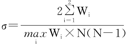 目前,关于加权网络密度的研究主要集中在两方面:首先,基于经济联系的加权网络密度将传统网络密度计算公式的分子实际边数改为实际联结强度,实现微观节点联结强度融入宏观[29]。但是,这种方法只能在联结强度小于等于1时有效,若联结强度大于1则难以保证加权网络密度小于等于1。其次,社区检测的加权网络往往将整体网划分为若干模块,利用基于模板网络密度的优化算法识别社区划分。这种方法进一步明确了网络密度计算公式的分母也应保留加权信息[30]。在社会网络研究中,学者们虽然主要基于二值网络的中心度权重构建加权网络密度,但依然采用分母保留加权信息的做法,且要求分母的加权信息应是矩阵(组)内最大可能[31]。参考以上研究思路,本文构建体现微观节点联结强度和分母保留加权信息的加权网络密度公式。