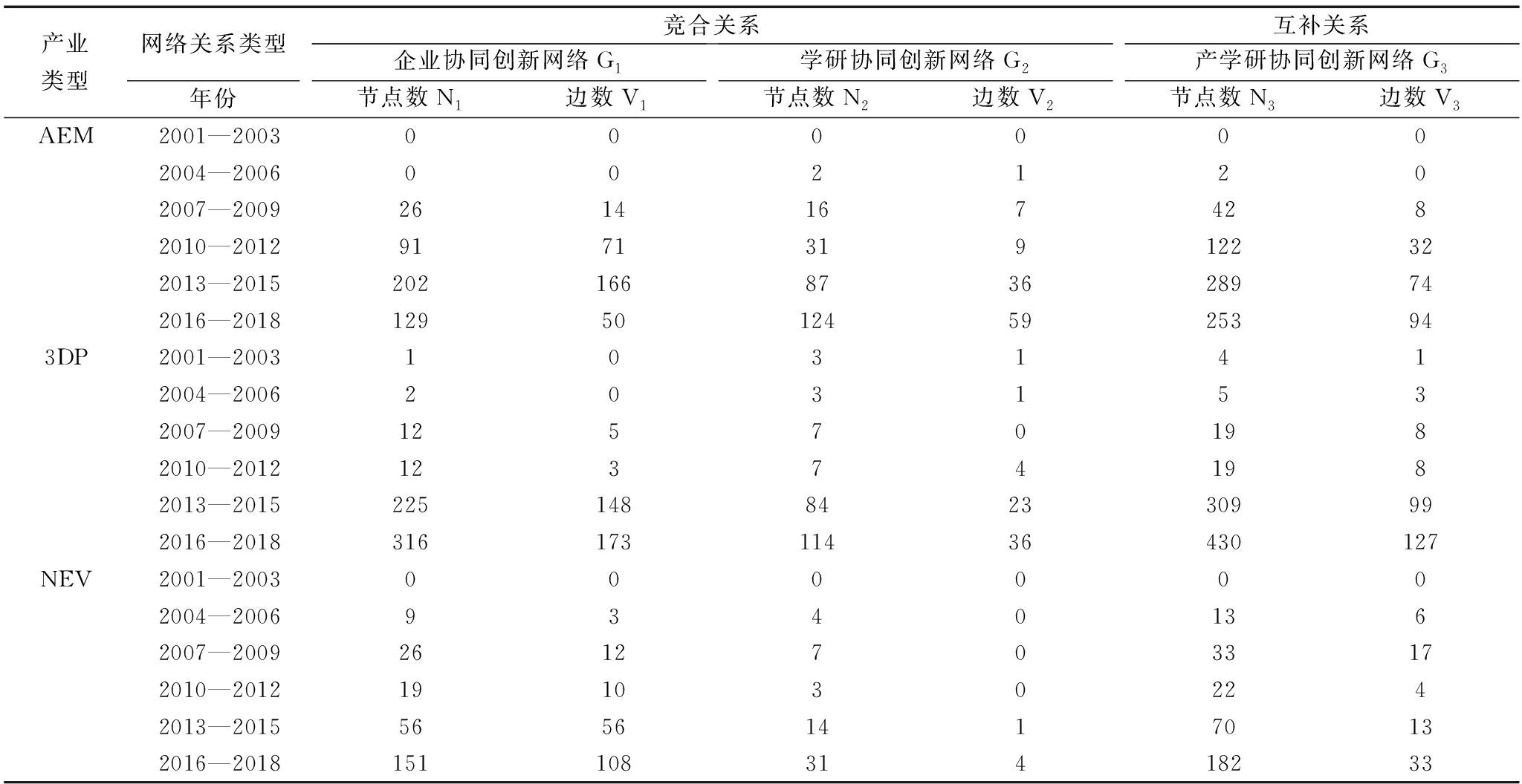 产业类型网络关系类型年份竞合关系企业协同创新网络G1节点数N1边数V1学研协同创新网络G2节点数N2边数V2互补关系产学研协同创新网络G3节点数N3边数V3AEM2001—20030000002004—20060021202007—200926141674282010—20129171319122322013—20152021668736289742016—20181295012459253943DP2001—20031031412004—20062031532007—2009125701982010—2012123741982013—20152251488423309992016—201831617311436430127NEV2001—20030000002004—200693401362007—200926127033172010—20121910302242013—2015565614170132016—201815110831418233