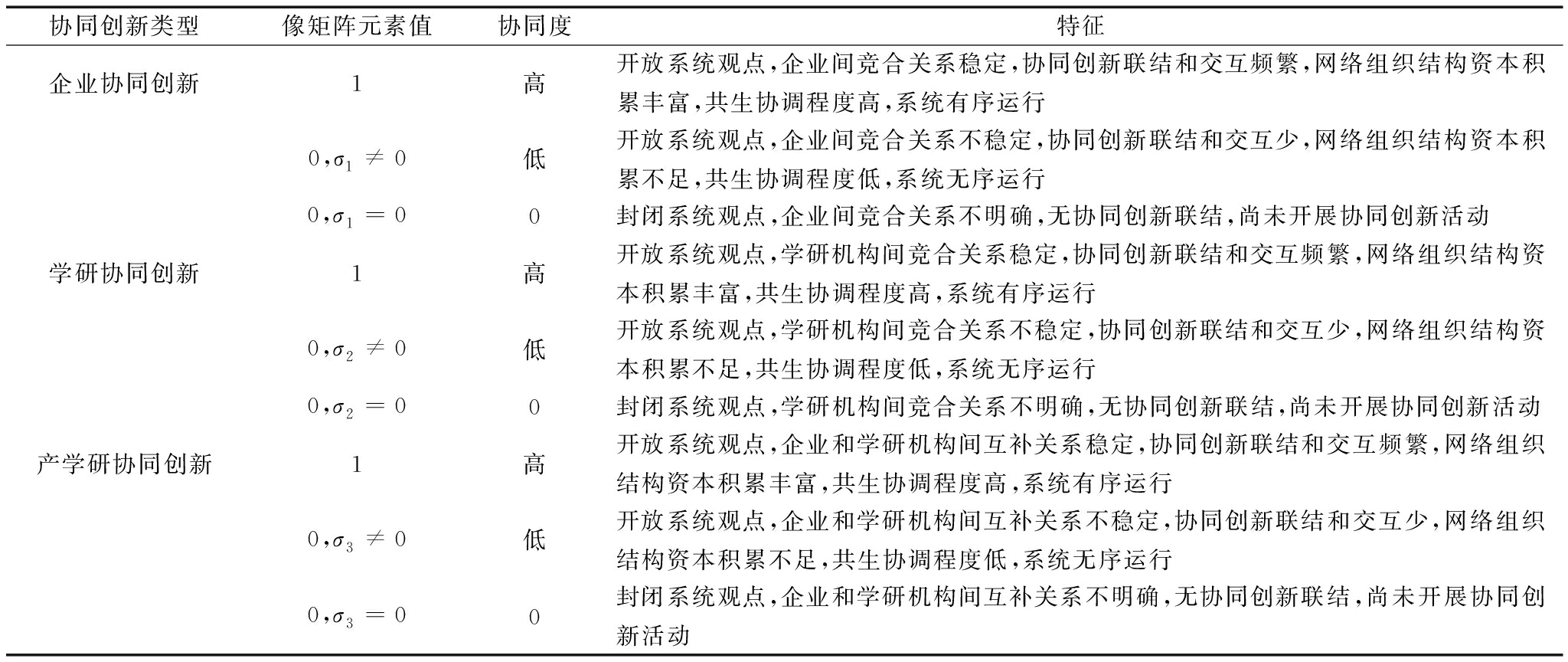 协同创新类型像矩阵元素值协同度特征企业协同创新1高开放系统观点,企业间竞合关系稳定,协同创新联结和交互频繁,网络组织结构资本积累丰富,共生协调程度高,系统有序运行0,σ1≠0低开放系统观点,企业间竞合关系不稳定,协同创新联结和交互少,网络组织结构资本积累不足,共生协调程度低,系统无序运行0,σ1=00封闭系统观点,企业间竞合关系不明确,无协同创新联结,尚未开展协同创新活动学研协同创新1高开放系统观点,学研机构间竞合关系稳定,协同创新联结和交互频繁,网络组织结构资本积累丰富,共生协调程度高,系统有序运行0,σ2≠0低开放系统观点,学研机构间竞合关系不稳定,协同创新联结和交互少,网络组织结构资本积累不足,共生协调程度低,系统无序运行0,σ2=00封闭系统观点,学研机构间竞合关系不明确,无协同创新联结,尚未开展协同创新活动产学研协同创新1高开放系统观点,企业和学研机构间互补关系稳定,协同创新联结和交互频繁,网络组织结构资本积累丰富,共生协调程度高,系统有序运行0,σ3≠0低开放系统观点,企业和学研机构间互补关系不稳定,协同创新联结和交互少,网络组织结构资本积累不足,共生协调程度低,系统无序运行0,σ3=00封闭系统观点,企业和学研机构间互补关系不明确,无协同创新联结,尚未开展协同创新活动