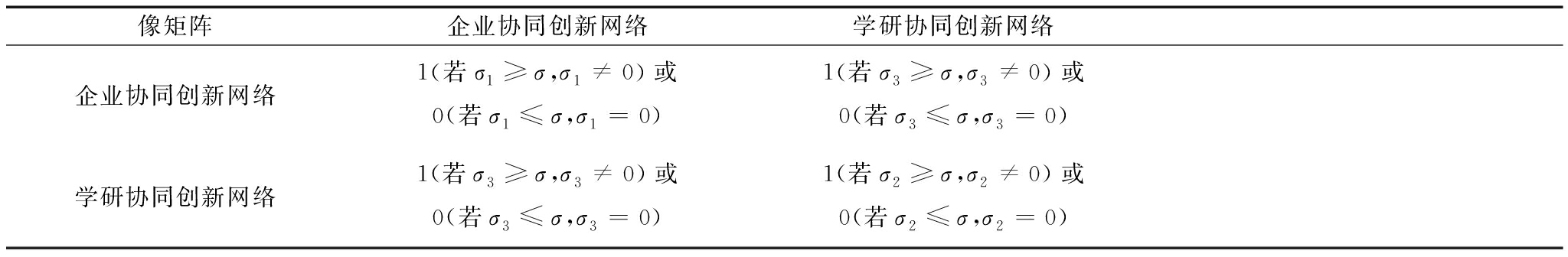 像矩阵企业协同创新网络学研协同创新网络企业协同创新网络1(若σ1≥σ,σ1≠0)或0(若σ1≤σ,σ1=0)1(若σ3≥σ,σ3≠0)或0(若σ3≤σ,σ3=0)学研协同创新网络1(若σ3≥σ,σ3≠0)或0(若σ3≤σ,σ3=0)1(若σ2≥σ,σ2≠0)或0(若σ2≤σ,σ2=0)