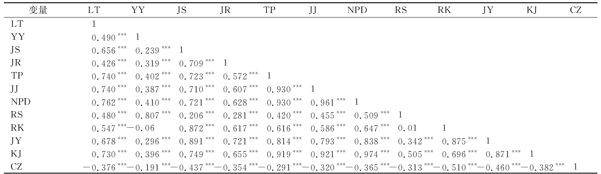 变量LTYYJSJRTPJJNPDRSRKJYKJCZLT1YY0.490***1JS0.656***0.239***1JR0.426***0.319***0.709***1TP0.740***0.402***0.723***0.572***1JJ0.740***0.387***0.710***0.607***0.930***1NPD0.762***0.410***0.721***0.628***0.930***0.961***1RS0.480***0.807***0.206***0.281***0.420***0.455***0.509***1RK0.547***-0.060.872***0.617***0.616***0.586***0.647***0.011JY0.678***0.296***0.891***0.721***0.814***0.793***0.838***0.342***0.875***1KJ0.730***0.396***0.749***0.655***0.919***0.921***0.974***0.505***0.696***0.871***1CZ-0.376***-0.191***-0.437***-0.354***-0.291***-0.320***-0.365***-0.313***-0.510***-0.460***-0.382***1