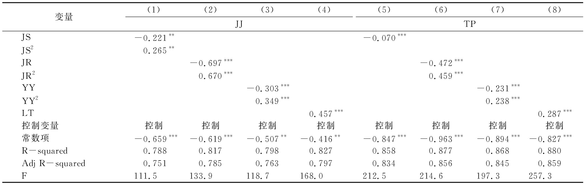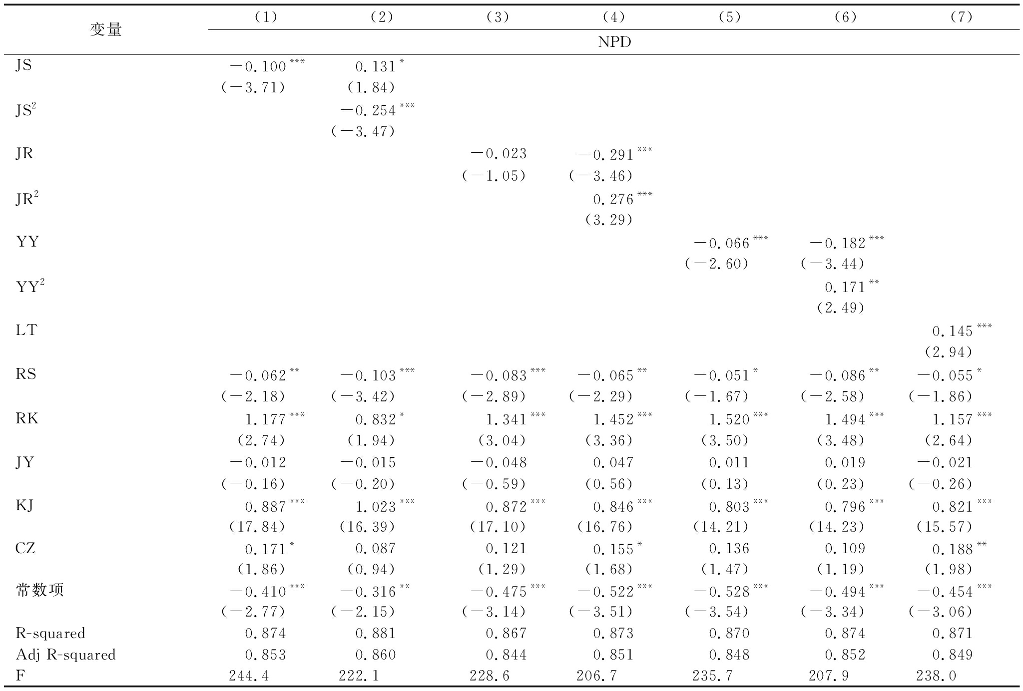 变量(1)(2)(3)(4)(5)(6)(7)NPDJS-0.100***0.131*(-3.71)(1.84)JS2-0.254***(-3.47)JR-0.023-0.291***(-1.05)(-3.46)JR20.276***(3.29)YY-0.066***-0.182***(-2.60)(-3.44)YY20.171**(2.49)LT0.145***(2.94)RS-0.062**-0.103***-0.083***-0.065**-0.051*-0.086**-0.055*(-2.18)(-3.42)(-2.89)(-2.29)(-1.67)(-2.58)(-1.86)RK1.177***0.832*1.341***1.452***1.520***1.494***1.157***(2.74)(1.94)(3.04)(3.36)(3.50)(3.48)(2.64)JY-0.012-0.015-0.0480.0470.0110.019-0.021(-0.16)(-0.20)(-0.59)(0.56)(0.13)(0.23)(-0.26)KJ0.887***1.023***0.872***0.846***0.803***0.796***0.821***(17.84)(16.39)(17.10)(16.76)(14.21)(14.23)(15.57)CZ0.171*0.0870.1210.155*0.1360.1090.188**(1.86)(0.94)(1.29)(1.68)(1.47)(1.19)(1.98)常数项-0.410***-0.316**-0.475***-0.522***-0.528***-0.494***-0.454***(-2.77)(-2.15)(-3.14)(-3.51)(-3.54)(-3.34)(-3.06)R-squared0.8740.8810.8670.8730.8700.8740.871Adj R-squared0.8530.8600.8440.8510.8480.8520.849F244.4222.1228.6206.7235.7207.9238.0