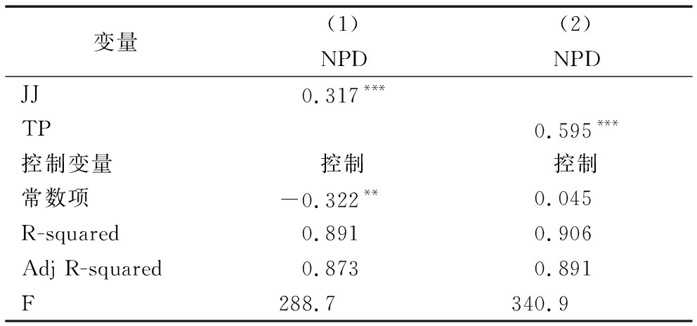 变量(1)(2)NPDNPDJJ0.317***TP0.595***控制变量控制控制常数项-0.322**0.045R-squared0.8910.906Adj R-squared0.8730.891F288.7340.9