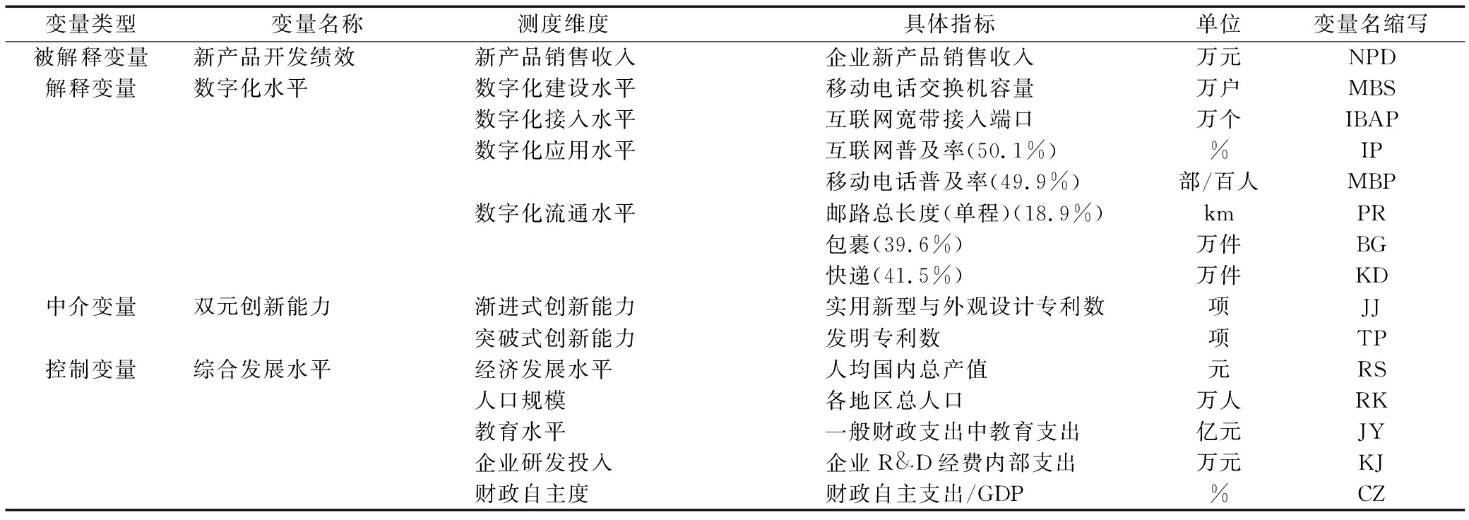 变量类型变量名称测度维度 具体指标 单位变量名缩写被解释变量新产品开发绩效新产品销售收入企业新产品销售收入万元NPD解释变量数字化水平数字化建设水平移动电话交换机容量万户MBS数字化接入水平互联网宽带接入端口万个IBAP数字化应用水平互联网普及率(50.1%)%IP移动电话普及率(49.9%)部/百人MBP数字化流通水平邮路总长度(单程)(18.9%)kmPR包裹(39.6%)万件BG快递(41.5%)万件KD中介变量双元创新能力渐进式创新能力实用新型与外观设计专利数项JJ突破式创新能力发明专利数项TP控制变量综合发展水平经济发展水平人均国内总产值元RS人口规模各地区总人口万人RK教育水平一般财政支出中教育支出亿元JY企业研发投入企业R&D经费内部支出万元KJ财政自主度财政自主支出/GDP%CZ