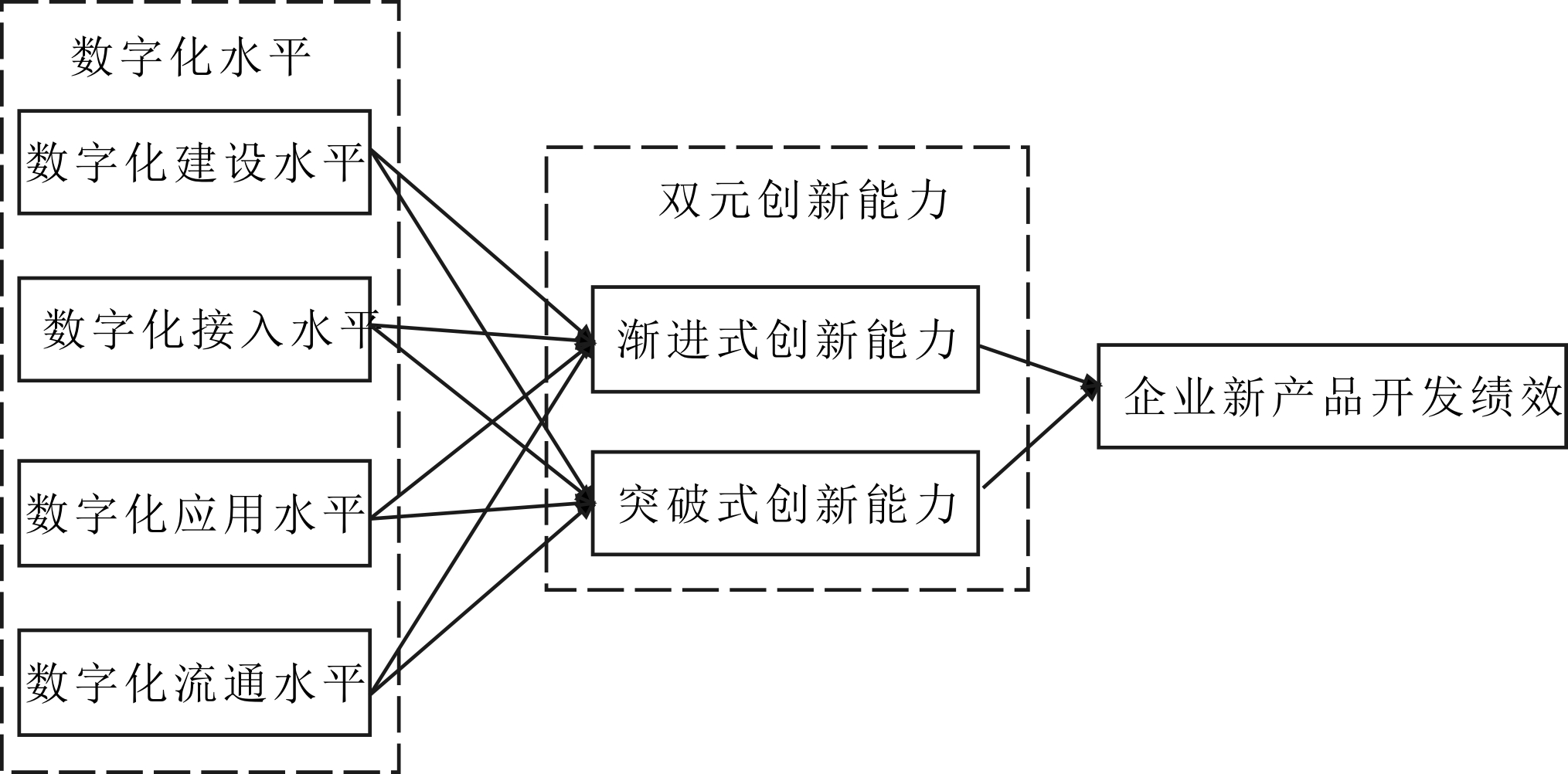 随着移动互联网的广泛应用,我国各行各业被卷入数字化转型的浪潮中。中国信息通信研究院发布的《中国数字经济发展白皮书(2020年)》指出,我国数字经济增加值由2005年的2.6万亿元增加到2019年的35.8万亿元,数字经济规模不断扩张,在国民经济中的地位不断提升。在数字化时代,传统工业企业纷纷实施数字化转型战略。但据统计,在具体落实过程中,约70%的数字转型计划没有如期完成。因此,关注数字化转型和数字化水平影响因素,对企业生存与发展极为重要。随着数字化发展,我国工业企业新产品销售收入逐年增加,《中国科技统计年鉴》数据显示,2019年全国各省份新产品销售收入占主营业务收入的比重均值为14.8%,浙江省高达34.3%。浙江是全国较早开启数字化建设且目前发展较为成熟的省份,数字化水平对企业新产品开发绩效是否具有重要影响?先进的数字技术、数字平台以及数字基础设施极大地改变了创新和创业精神,数字技术对价值创造和价值获取具有广泛的影响,数字化技术可以为企业创新发展提供新信息、新技术[1-2]。数字时代下,企业面临较大的不确定性,渐进式和突破式创新能力能否帮助企业提升创新绩效?需要关注两种创新能力的重要性和差异性,寻找有效创新路径以实现企业可持续发展。为此,本文将数字化水平、双元创新能力以及新产品开发绩效纳入同一框架,探索数字化水平对企业新产品开发绩效的影响机制,检验双元创新能力在其中是否起中介传导作用,对于重塑企业创新优势具有重要理论意义和现实价值。