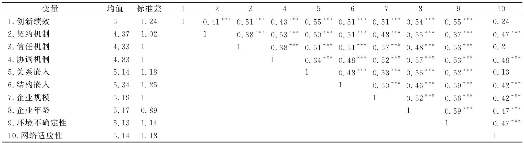 变量均值标准差123456789101.创新绩效51.2410.41***0.51***0.43***0.55***0.51***0.51***0.54***0.55***0.242.契约机制4.371.02 10.38***0.53***0.50***0.51***0.48***0.55***0.37***0.47***3.信任机制4.331 10.38***0.51***0.51***0.57***0.48***0.53***0.24.协调机制4.831 10.34***0.48***0.52***0.57***0.53***0.48***5.关系嵌入5.141.18 10.48***0.53***0.56***0.52***0.136.结构嵌入5.341.25 10.50***0.46***0.59***0.42***7.企业规模5.191 10.52***0.56***0.42***8.企业年龄5.170.89 10.59***0.47***9.环境不确定性5.131.14 10.47***10.网络适应性5.141.18 1