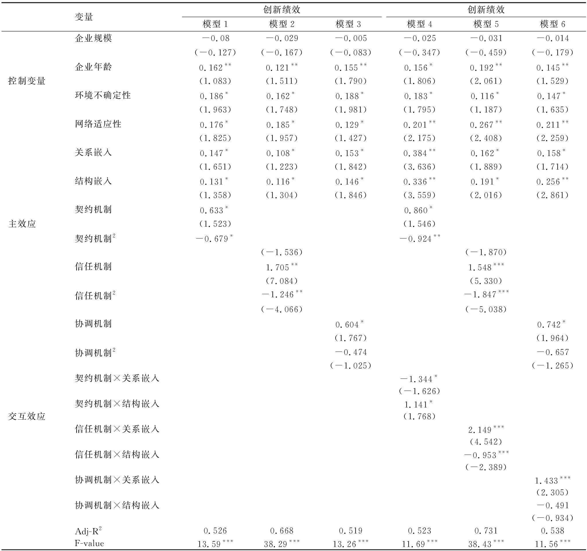变量创新绩效模型1模型2模型3创新绩效模型4模型5模型6企业规模-0.08-0.029-0.005-0.025-0.031-0.014(-0.127)(-0.167)(-0.083)(-0.347)(-0.459)(-0.179)企业年龄0.162**0.121**0.155**0.156*0.192**0.145**控制变量(1.083)(1.511)(1.790)(1.806)(2.061)(1.529)环境不确定性0.186*0.162*0.188*0.183*0.116*0.147*(1.963)(1.748)(1.981)(1.795)(1.187)(1.635)网络适应性0.176*0.185*0.129*0.201**0.267**0.211**(1.825)(1.957)(1.427)(2.175)(2.408)(2.259)关系嵌入0.147*0.108*0.153*0.384**0.162*0.158*(1.651)(1.223)(1.842)(3.636)(1.889)(1.714)结构嵌入0.131*0.116*0.146*0.336**0.191*0.256**(1.358)(1.304)(1.846)(3.559)(2.016)(2.861)契约机制0.633*0.860*主效应(1.523)(1.546)契约机制2-0.679*-0.924**(-1.536)(-1.870)信任机制1.705**1.548***(7.084)(5.330)信任机制2-1.246**-1.847***(-4.066)(-5.038)协调机制0.604*0.742*(1.767)(1.964)协调机制2-0.474-0.657(-1.025)(-1.265)契约机制×关系嵌入-1.344*(-1.626)契约机制×结构嵌入1.141*交互效应(1.768)信任机制×关系嵌入2.149***(4.542)信任机制×结构嵌入-0.953***(-2.389)协调机制×关系嵌入1.433***(2.305)协调机制×结构嵌入-0.491(-0.934)Adj-R20.5260.6680.5190.5230.7310.538F-value13.59***38.29***13.26***11.69***38.43***11.56***