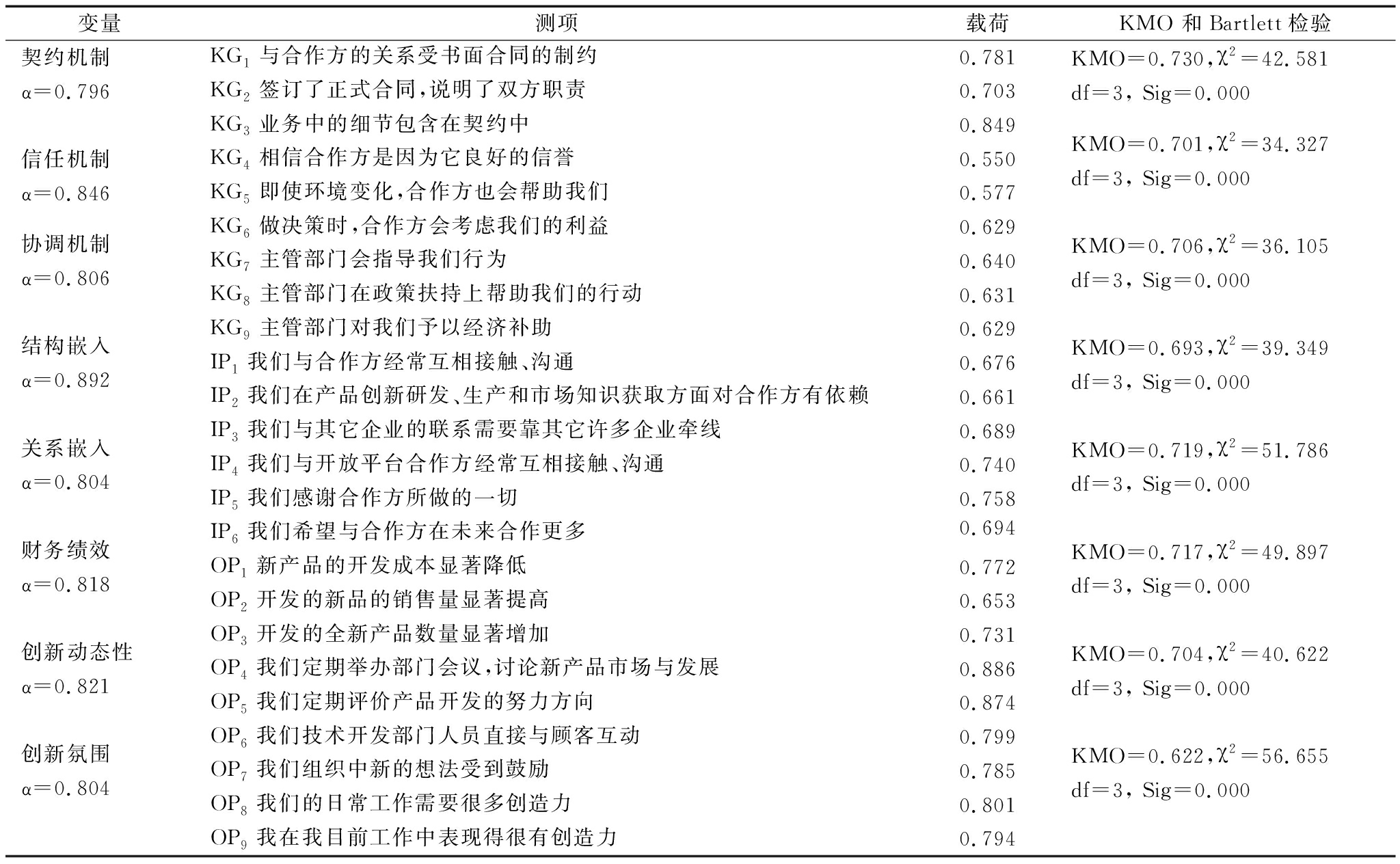 变量测项载荷KMO 和Bartlett检验契约机制α=0.796KG1与合作方的关系受书面合同的制约0.781KMO=0.730,χ2=42.581df=3, Sig=0.000KG2签订了正式合同,说明了双方职责0.703KG3业务中的细节包含在契约中0.849信任机制α=0.846KG4相信合作方是因为它良好的信誉0.550KMO=0.701,χ2=34.327df=3, Sig=0.000KG5即使环境变化,合作方也会帮助我们0.577KG6做决策时,合作方会考虑我们的利益0.629协调机制α=0.806KG7主管部门会指导我们行为0.640KMO=0.706,χ2=36.105 df=3, Sig=0.000KG8主管部门在政策扶持上帮助我们的行动0.631KG9主管部门对我们予以经济补助0.629结构嵌入α=0.892IP1我们与合作方经常互相接触、沟通0.676KMO=0.693,χ2=39.349df=3, Sig=0.000IP2我们在产品创新研发、生产和市场知识获取方面对合作方有依赖0.661IP3我们与其它企业的联系需要靠其它许多企业牵线0.689关系嵌入α=0.804IP4我们与开放平台合作方经常互相接触、沟通0.740KMO=0.719,χ2=51.786df=3, Sig=0.000IP5我们感谢合作方所做的一切0.758IP6我们希望与合作方在未来合作更多0.694财务绩效α=0.818OP1新产品的开发成本显著降低0.772KMO=0.717,χ2=49.897df=3, Sig=0.000OP2开发的新品的销售量显著提高0.653OP3开发的全新产品数量显著增加0.731创新动态性α=0.821OP4我们定期举办部门会议,讨论新产品市场与发展0.886KMO=0.704,χ2=40.622df=3, Sig=0.000OP5我们定期评价产品开发的努力方向0.874OP6我们技术开发部门人员直接与顾客互动0.799创新氛围α=0.804OP7我们组织中新的想法受到鼓励0.785KMO=0.622,χ2=56.655df=3, Sig=0.000OP8我们的日常工作需要很多创造力0.801OP9我在我目前工作中表现得很有创造力0.794