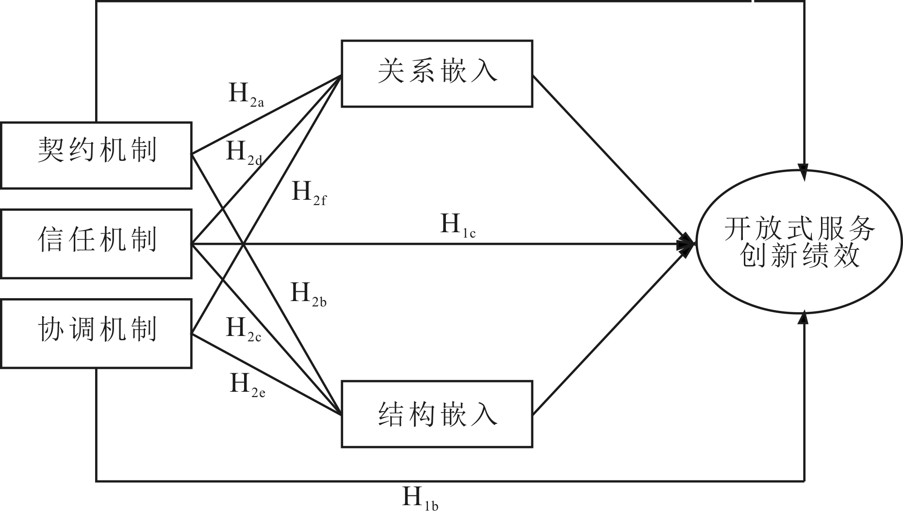 综合上述文献可知,对于网络嵌入与创新绩效,大多数学者从差异化战略、交易成本理论等方面进行探析;对于治理机制与创新绩效,多基于双边交易关系治理层面加以探析;关于网络嵌入与治理机制的研究,大多从嵌入关系强度层面对治理机制进行分析。国内外学者虽从各种角度对网络嵌入、治理机制、企业创新绩效的相互关系进行了探究,但将三者纳入同一框架进行研究的文献少见,将网络嵌入与治理机制结合,研究二者对于开放式服务创新绩效的作用机理更是鲜见。治理机制作为网络平台治理模式的重要组成部分,其在不同网络关系中对开放式服务创新绩效的作用机理并没有得到充分探析。因此,本文基于已有研究,从网络嵌入视角,对治理机制、创新绩效相关理论进行有效整合,深层次探讨网络嵌入、治理机制与开放式服务创新绩效三者之间的本质关系。