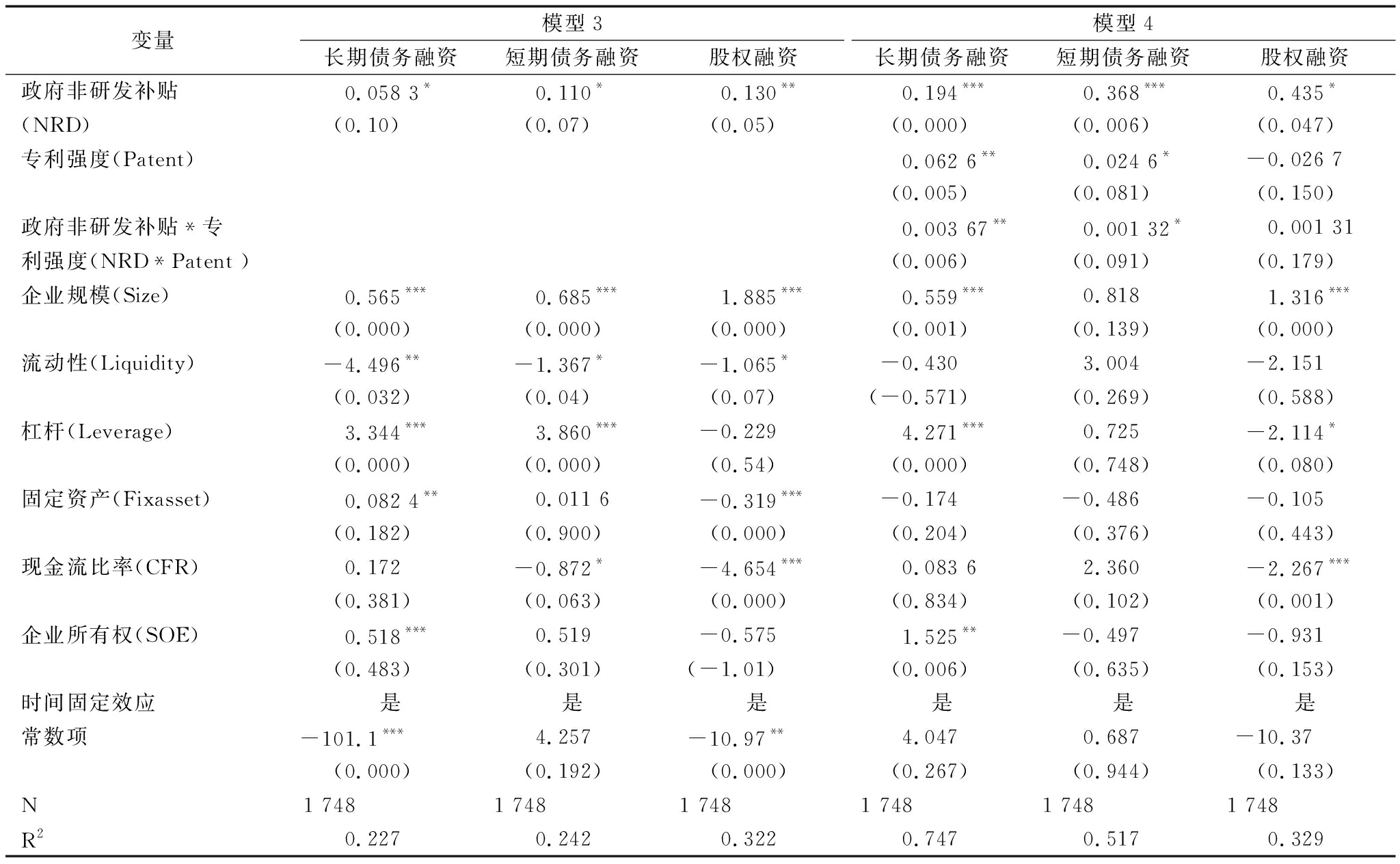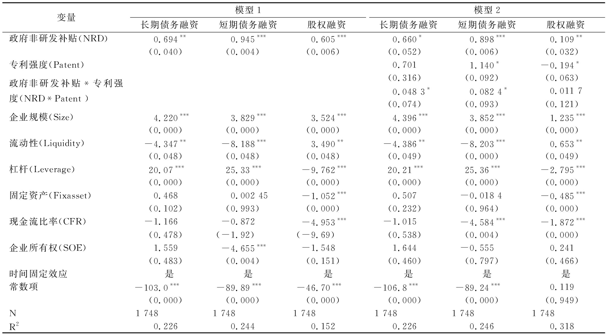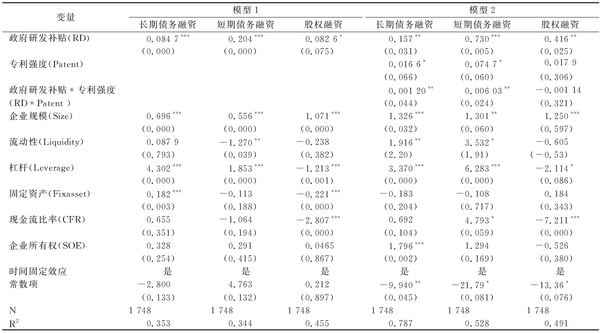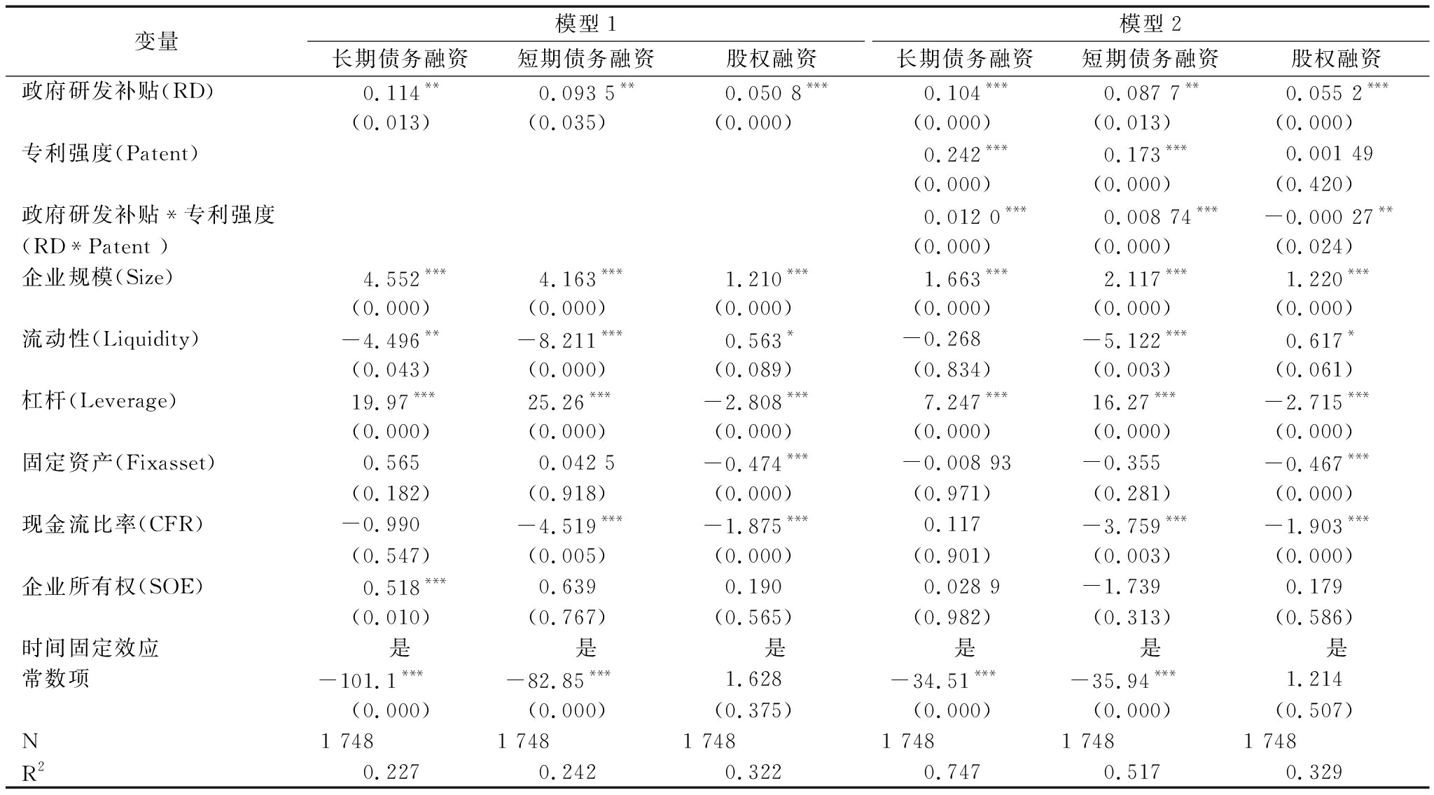 变量模型1长期债务融资短期债务融资股权融资模型2长期债务融资短期债务融资股权融资政府研发补贴(RD)0.114**0.093 5**0.050 8***0.104***0.087 7**0.055 2***(0.013)(0.035)(0.000)(0.000)(0.013)(0.000) 专利强度(Patent)0.242***0.173***0.001 49(0.000)(0.000)(0.420) 政府研发补贴*专利强度0.012 0***0.008 74***-0.000 27**(RD*Patent )(0.000)(0.000)(0.024) 企业规模(Size)4.552***4.163***1.210***1.663***2.117***1.220***(0.000)(0.000)(0.000)(0.000)(0.000)(0.000)流动性(Liquidity)-4.496**-8.211***0.563*-0.268-5.122***0.617*(0.043)(0.000)(0.089)(0.834)(0.003)(0.061)杠杆(Leverage)19.97***25.26***-2.808***7.247***16.27***-2.715***(0.000)(0.000)(0.000)(0.000)(0.000)(0.000)固定资产(Fixasset)0.5650.042 5-0.474***-0.008 93-0.355-0.467***(0.182)(0.918)(0.000)(0.971)(0.281)(0.000)现金流比率(CFR)-0.990-4.519***-1.875***0.117-3.759***-1.903***(0.547) (0.005)(0.000)(0.901)(0.003)(0.000) 企业所有权(SOE)0.518***0.6390.1900.028 9-1.7390.179(0.010)(0.767)(0.565)(0.982)(0.313)(0.586)时间固定效应是是是是是是常数项-101.1***-82.85***1.628-34.51***-35.94***1.214(0.000) (0.000) (0.375)(0.000)(0.000)(0.507)N1 7481 7481 748 1 7481 7481 748R20.2270.2420.3220.7470.5170.329