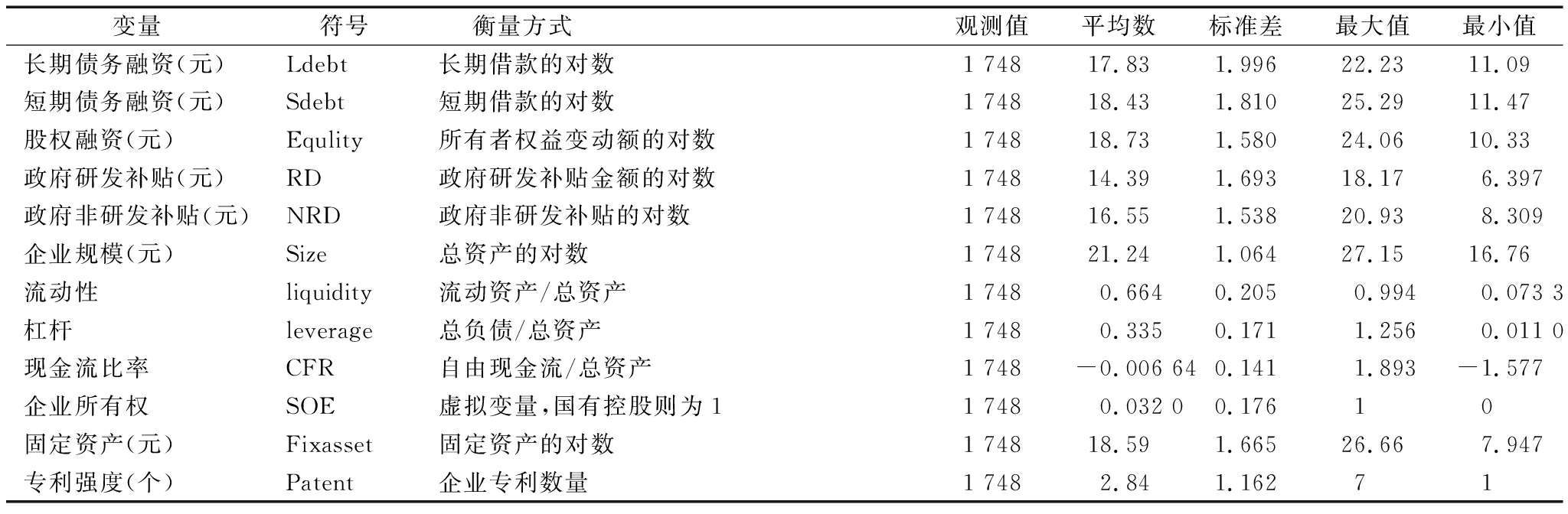 变量符号衡量方式观测值平均数标准差最大值最小值长期债务融资(元)Ldebt长期借款的对数1 74817.831.99622.2311.09短期债务融资(元)Sdebt短期借款的对数1 74818.431.81025.2911.47股权融资(元)Equlity所有者权益变动额的对数1 74818.731.58024.0610.33政府研发补贴(元)RD政府研发补贴金额的对数1 74814.391.69318.176.397政府非研发补贴(元)NRD政府非研发补贴的对数1 74816.551.53820.938.309企业规模(元)Size总资产的对数1 74821.241.06427.1516.76流动性liquidity流动资产/总资产1 7480.6640.2050.9940.073 3杠杆leverage总负债/总资产1 7480.3350.1711.2560.011 0现金流比率CFR自由现金流/总资产1 748-0.006 640.1411.893-1.577企业所有权SOE虚拟变量,国有控股则为11 7480.032 00.17610固定资产(元)Fixasset固定资产的对数1 74818.591.66526.667.947专利强度(个)Patent企业专利数量1 7482.841.16271