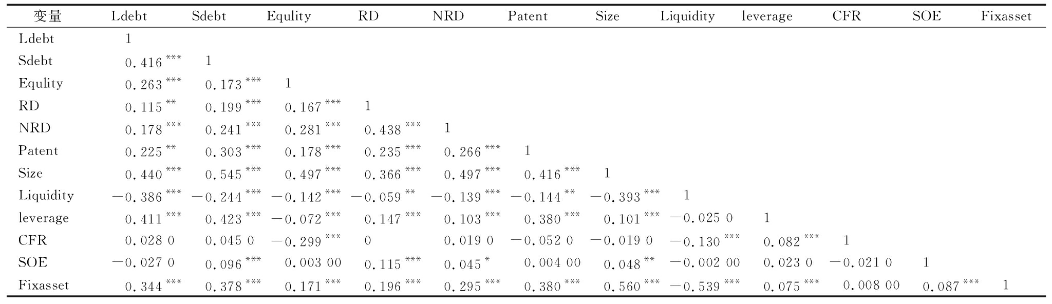 变量LdebtSdebtEqulityRDNRDPatentSizeLiquidityleverageCFRSOEFixassetLdebt1Sdebt0.416***1Equlity0.263***0.173***1RD0.115**0.199***0.167***1NRD0.178***0.241***0.281***0.438***1Patent0.225**0.303***0.178***0.235***0.266***1Size0.440***0.545***0.497***0.366***0.497***0.416***1Liquidity-0.386***-0.244***-0.142***-0.059**-0.139***-0.144**-0.393***1leverage0.411***0.423***-0.072***0.147***0.103***0.380***0.101***-0.025 01CFR0.028 00.045 0-0.299***00.019 0-0.052 0-0.019 0-0.130***0.082***1SOE-0.027 00.096***0.003 000.115***0.045*0.004 000.048**-0.002 000.023 0-0.021 01Fixasset0.344***0.378***0.171***0.196***0.295***0.380***0.560***-0.539***0.075***0.008 000.087***1