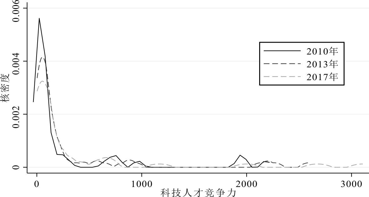图4 长三角科技人才竞争力核密度估计(2010-2017年)