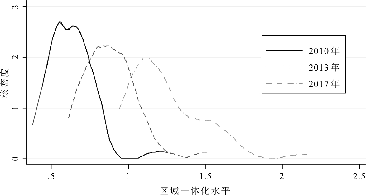 图2 长三角区域一体化水平核密度估计(2010-2017年)