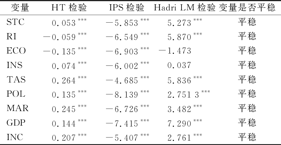 变量HT检验IPS检验Hadri LM检验变量是否平稳STC0.053***-5.853***5.273***平稳RI-0.059***-6.549***5.870***平稳ECO-0.135***-6.903***-1.473平稳INS0.074***-6.002***0.037平稳TAS0.264***-4.685***5.836***平稳POL0.135***-8.139***2.751 3***平稳MAR0.245***-6.726***3.482***平稳GDP0.144***-7.415***7.290***平稳INC0.207***-5.407***2.761***平稳