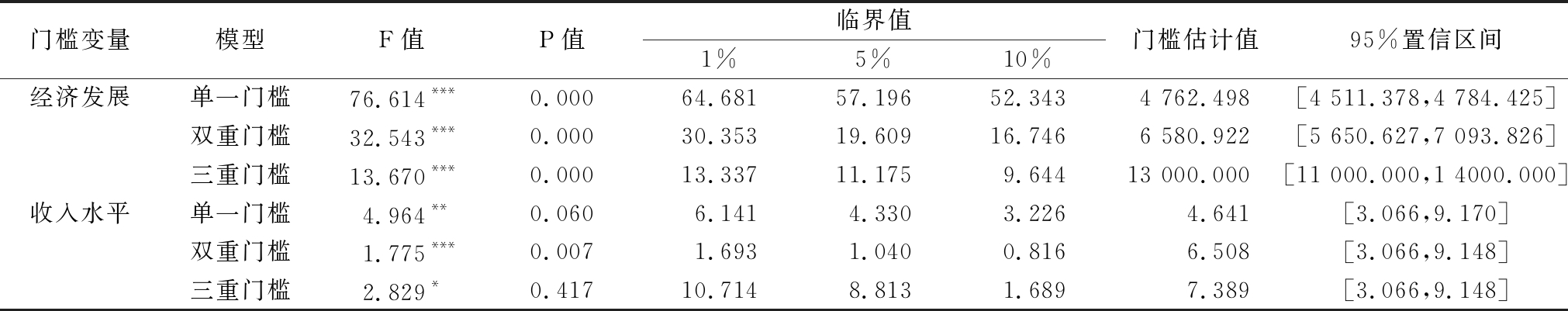 门槛变量模型F值P值临界值1%5%10%门槛估计值95%置信区间经济发展单一门槛76.614***0.000 64.68157.19652.3434 762.498[4 511.378,4 784.425]双重门槛32.543***0.000 30.35319.60916.7466 580.922[5 650.627,7 093.826]三重门槛13.670***0.000 13.337 11.175 9.644 13 000.000 [11 000.000,1 4000.000]收入水平单一门槛4.964**0.060 6.141 4.330 3.226 4.641[3.066,9.170]双重门槛1.775***0.007 1.693 1.040 0.816 6.508[3.066,9.148]三重门槛2.829*0.417 10.714 8.813 1.689 7.389[3.066,9.148]