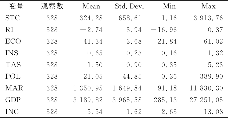 变量观察数MeanStd.Dev.MinMaxSTC328324.28658.611.163 913.76RI328-2.743.94-16.960.37ECO32841.343.6821.8461.02INS3280.650.230.161.32TAS3281.500.900.355.23POL32821.0544.850.36389.90MAR3281 350.951 649.8491.1811 830.30GDP3283 189.823 965.58285.1327 251.05INC3285.541.622.6313.08