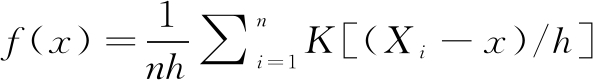 其中,f(x)为变量 X的密度函数,n为样本观测值个数,K[.]为Epanechnikov核函数,h为带宽,Xi为独立同分布的观测值,x为均值;h*为带宽h的估计方法,δ为常数,iqr为样本四分位距,s表示样本标准差。