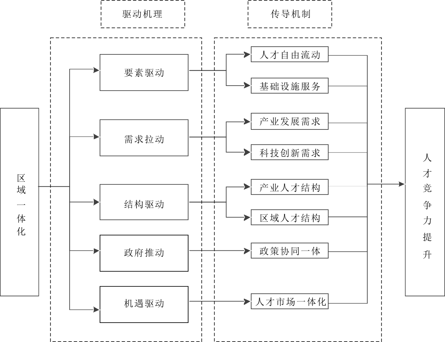 区域间基础设施和公共服务不完善导致对科技人才吸引力降低,加之行政壁垒和地方保护主义的存在,阻碍了不同类型科技人才在产业和地区间的流动,由此导致区域科技人才数量和质量无法显著增加,这是限制区域人才竞争力提升的重要原因之一。区域一体化发展可以促进人才自由流动并有效提高区域基础设施和服务环境水平,不断吸引科技人才流入,强化科技人才集聚效应,从而在要素层面驱动科技人才竞争力提升。首先,区域一体化可以削弱政策和行政壁垒,有利于科技人才及相关要素自由流动,促进各种科技要素和人才要素区域内有效配置,实现区域内不同类型科技人才结构优化;其次,区域一体化发展可以有效促进区域内相关基础设施建设,并不断提升公共服务和科研环境水平,提高人才相关生活保障支撑和软硬件服务,依靠基本公共服务平台,完善养老、医疗和教育等人才服务体系,不断强化科技人才留任意愿,促进科技人才竞争力提升。