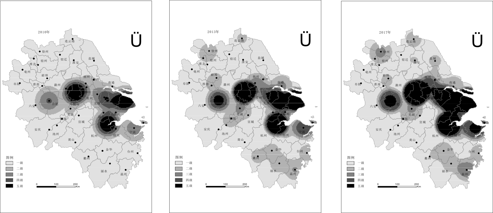 图3 长三角区域一体化空间格局动态演化(2010-2017年)