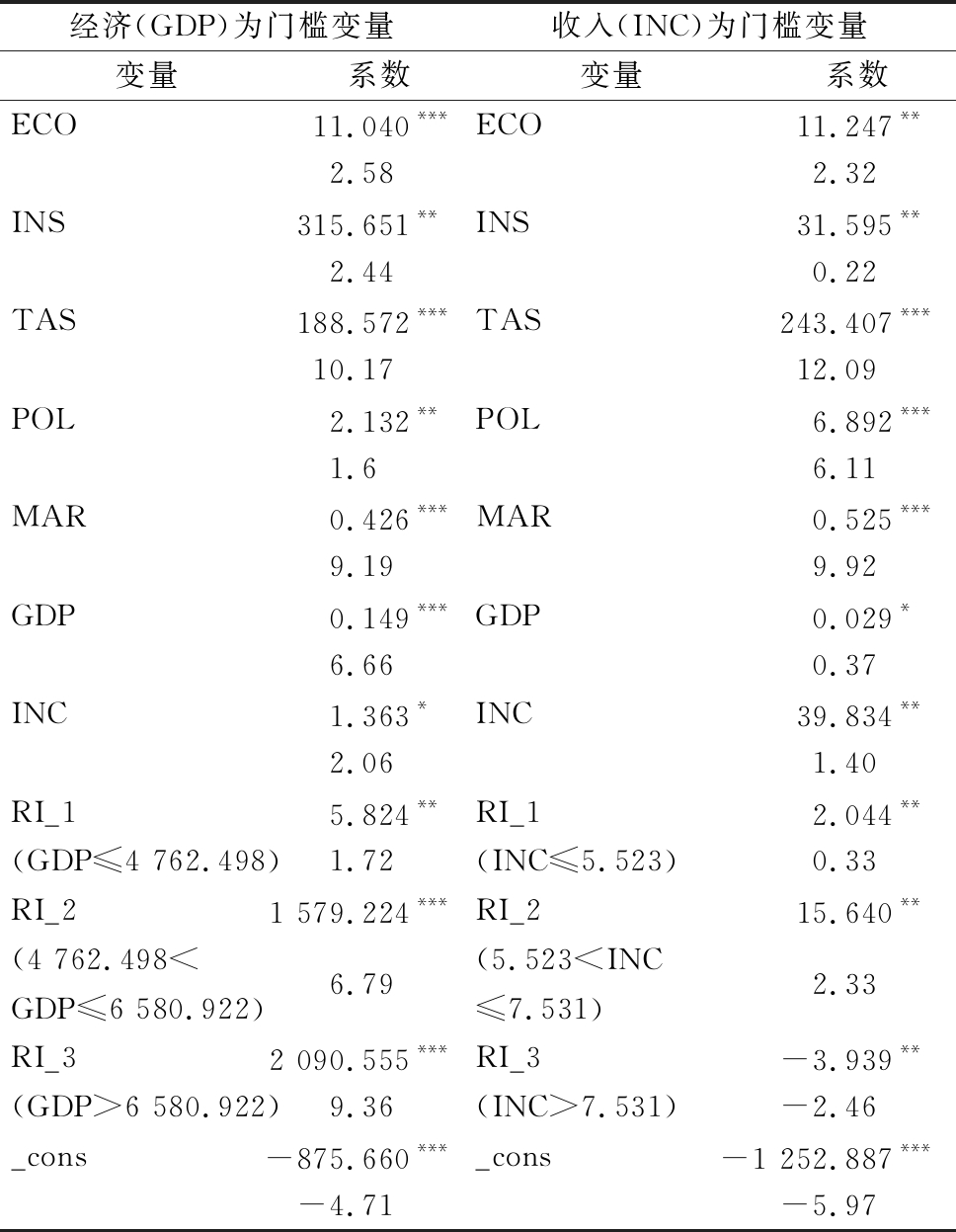 经济(GDP)为门槛变量变量系数收入(INC)为门槛变量变量系数ECO11.040***ECO11.247**2.582.32INS315.651**INS31.595**2.440.22TAS188.572***TAS243.407***10.1712.09POL2.132**POL6.892***1.66.11MAR0.426***MAR0.525***9.199.92GDP0.149***GDP0.029*6.660.37INC1.363*INC39.834**2.061.40 RI_15.824**RI_12.044**(GDP≤4 762.498)1.72(INC≤5.523)0.33RI_21 579.224***RI_215.640**(4 762.498