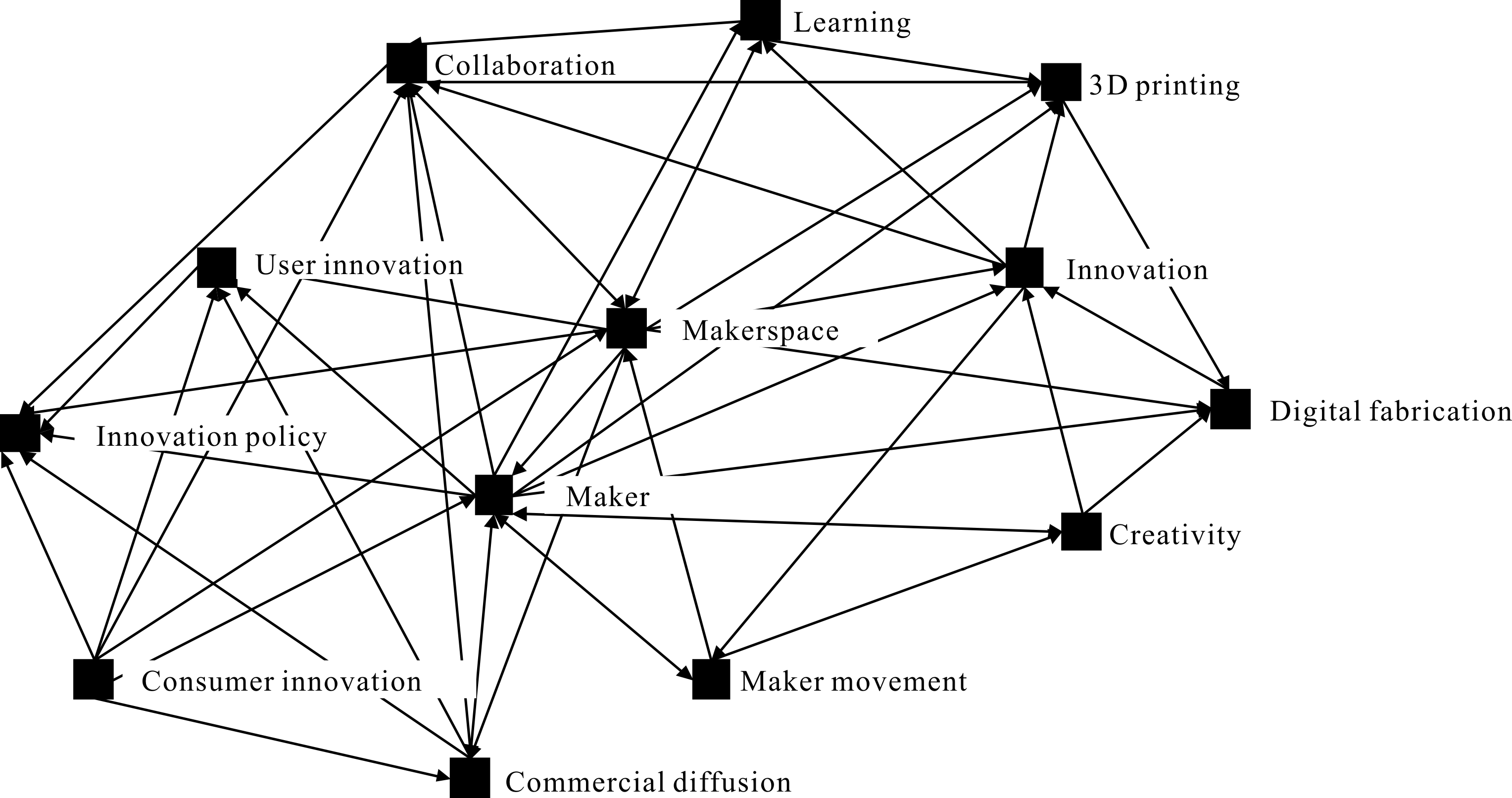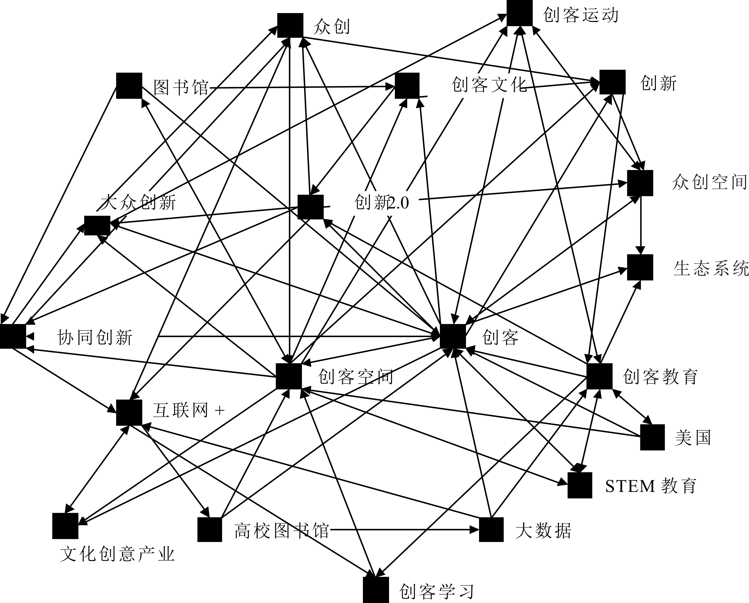 社会网络分析是社会学家基于数学和图论演变而来的一种计量方法,可用于刻画、测量行动者之间的关系,社会网络分析兼具关系论思维方式和工具功能,适用于解释管理学和社会学领域的相关问题。本文从社会网络视角,基于既有文献中的关键词探究创客与众创空间、创新、众创等之间的网络关系,揭示创客资本特征,进而为归纳创客资本内涵界定奠定理论基础。