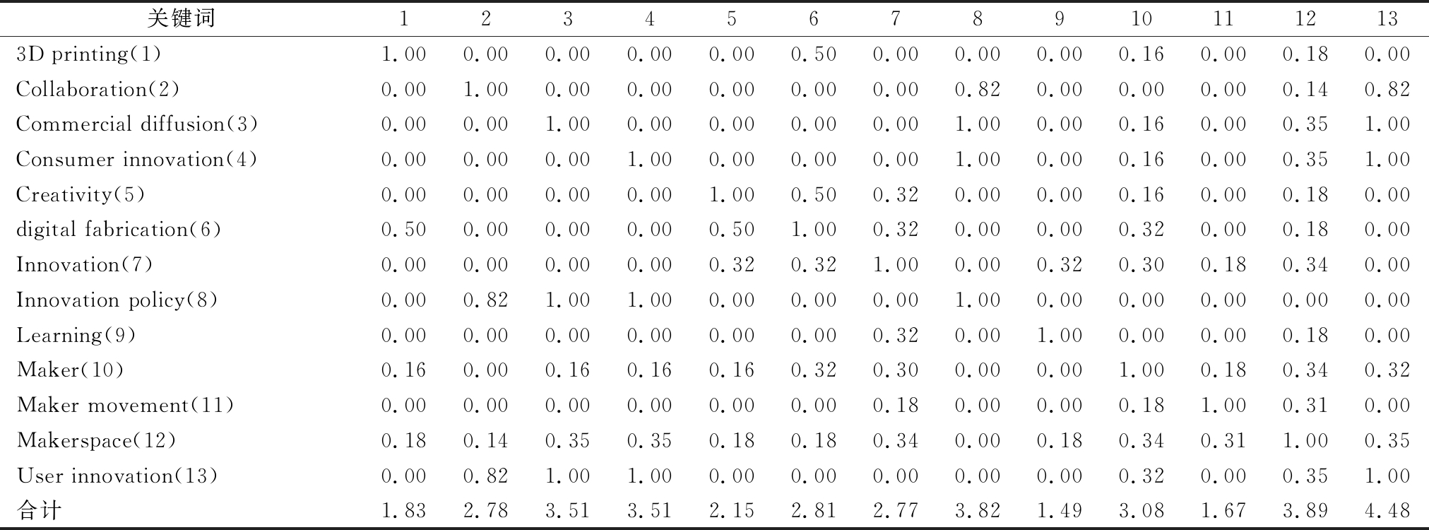 关键词123456789101112133D printing(1)1.000.000.000.000.000.500.000.000.000.160.000.180.00Collaboration(2)0.001.000.000.000.000.000.000.820.000.000.000.140.82Commercial diffusion(3)0.000.001.000.000.000.000.001.000.000.160.000.351.00Consumer innovation(4)0.000.000.001.000.000.000.001.000.000.160.000.351.00Creativity(5)0.000.000.000.001.000.500.320.000.000.160.000.180.00digital fabrication(6)0.500.000.000.000.501.000.320.000.000.320.000.180.00Innovation(7)0.000.000.000.000.320.321.000.000.320.300.180.340.00Innovation policy(8)0.000.821.001.000.000.000.001.000.000.000.000.000.00Learning(9)0.000.000.000.000.000.000.320.001.000.000.000.180.00Maker(10)0.160.000.160.160.160.320.300.000.001.000.180.340.32Maker movement(11)0.000.000.000.000.000.000.180.000.000.181.000.310.00Makerspace(12)0.180.140.350.350.180.180.340.000.180.340.311.000.35User innovation(13)0.000.821.001.000.000.000.000.000.000.320.000.351.00合计1.832.783.513.512.152.812.773.821.493.081.673.894.48