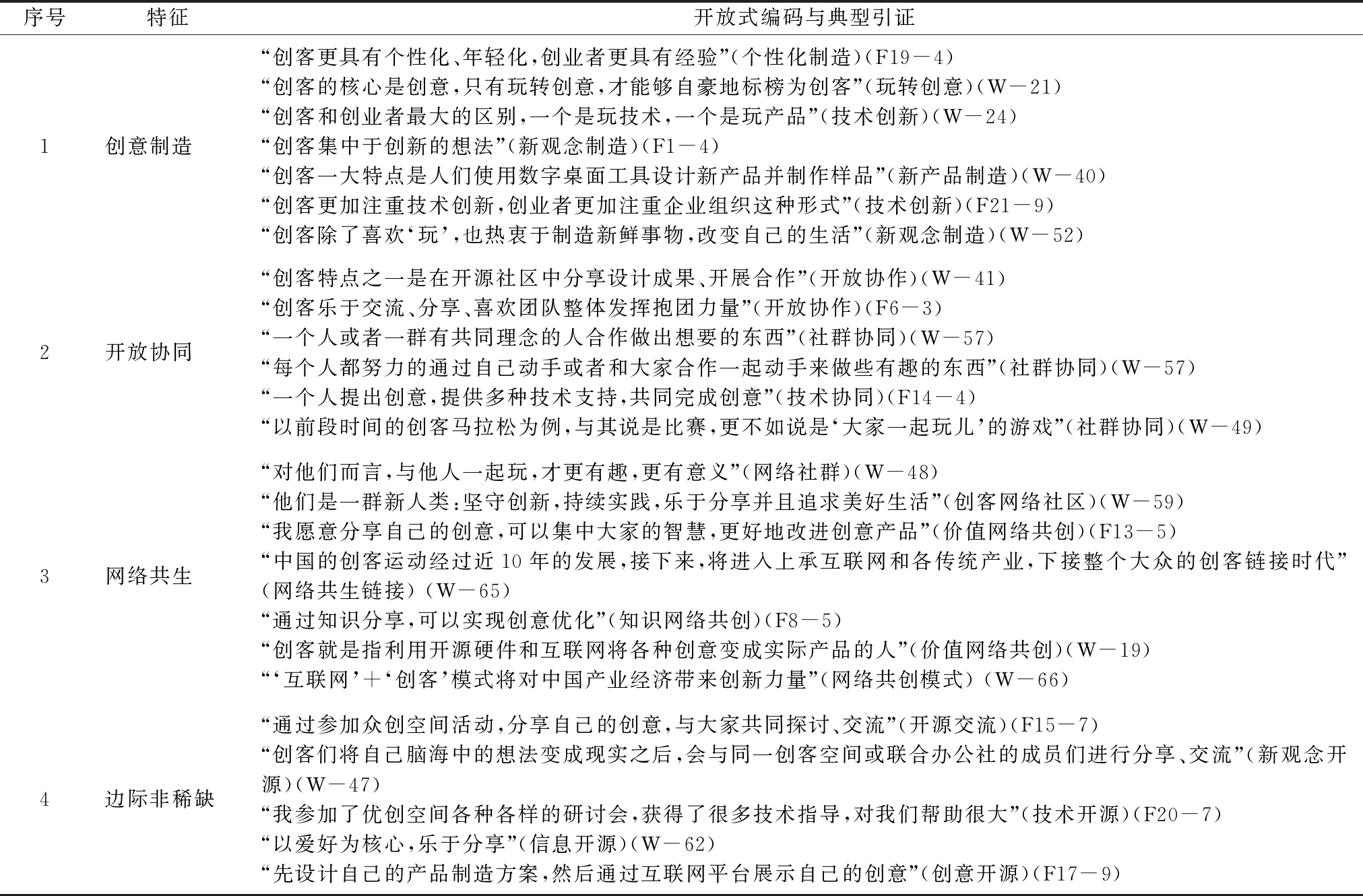 序号特征开放式编码与典型引证1创意制造“创客更具有个性化、年轻化,创业者更具有经验”(个性化制造)(F19-4)“创客的核心是创意,只有玩转创意,才能够自豪地标榜为创客”(玩转创意)(W-21)“创客和创业者最大的区别,一个是玩技术,一个是玩产品”(技术创新)(W-24)“创客集中于创新的想法”(新观念制造)(F1-4)“创客一大特点是人们使用数字桌面工具设计新产品并制作样品”(新产品制造)(W-40)“创客更加注重技术创新,创业者更加注重企业组织这种形式”(技术创新)(F21-9)“创客除了喜欢‘玩’,也热衷于制造新鲜事物,改变自己的生活”(新观念制造)(W-52)2开放协同“创客特点之一是在开源社区中分享设计成果、开展合作”(开放协作)(W-41)“创客乐于交流、分享、喜欢团队整体发挥抱团力量”(开放协作)(F6-3)“一个人或者一群有共同理念的人合作做出想要的东西”(社群协同)(W-57)“每个人都努力的通过自己动手或者和大家合作一起动手来做些有趣的东西”(社群协同)(W-57)“一个人提出创意,提供多种技术支持,共同完成创意”(技术协同)(F14-4)“以前段时间的创客马拉松为例,与其说是比赛,更不如说是‘大家一起玩儿’的游戏”(社群协同)(W-49)3网络共生“对他们而言,与他人一起玩,才更有趣,更有意义”(网络社群)(W-48)“他们是一群新人类:坚守创新,持续实践,乐于分享并且追求美好生活”(创客网络社区)(W-59)“我愿意分享自己的创意,可以集中大家的智慧,更好地改进创意产品”(价值网络共创)(F13-5)“中国的创客运动经过近10年的发展,接下来,将进入上承互联网和各传统产业,下接整个大众的创客链接时代”(网络共生链接) (W-65)“通过知识分享,可以实现创意优化”(知识网络共创)(F8-5)“创客就是指利用开源硬件和互联网将各种创意变成实际产品的人”(价值网络共创)(W-19)“‘互联网’+‘创客’模式将对中国产业经济带来创新力量”(网络共创模式) (W-66)4边际非稀缺“通过参加众创空间活动,分享自己的创意,与大家共同探讨、交流”(开源交流)(F15-7)“创客们将自己脑海中的想法变成现实之后,会与同一创客空间或联合办公社的成员们进行分享、交流”(新观念开源)(W-47)“我参加了优创空间各种各样的研讨会,获得了很多技术指导,对我们帮助很大”(技术开源)(F20-7)“以爱好为核心,乐于分享”(信息开源)(W-62)“先设计自己的产品制造方案,然后通过互联网平台展示自己的创意”(创意开源)(F17-9)