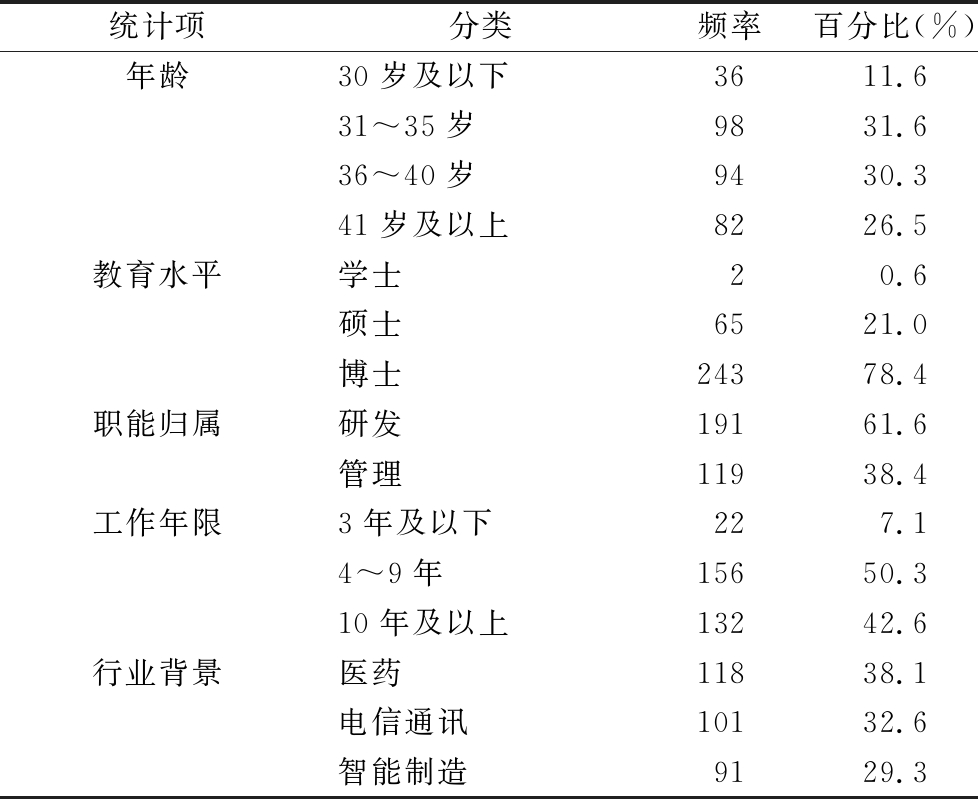 统计项分类频率百分比(%)年龄30岁及以下3611.631~35岁9831.636~40岁9430.341岁及以上8226.5教育水平学士20.6硕士6521.0博士24378.4职能归属研发19161.6管理11938.4工作年限3年及以下227.14~9年15650.310年及以上13242.6行业背景医药11838.1电信通讯10132.6智能制造9129.3