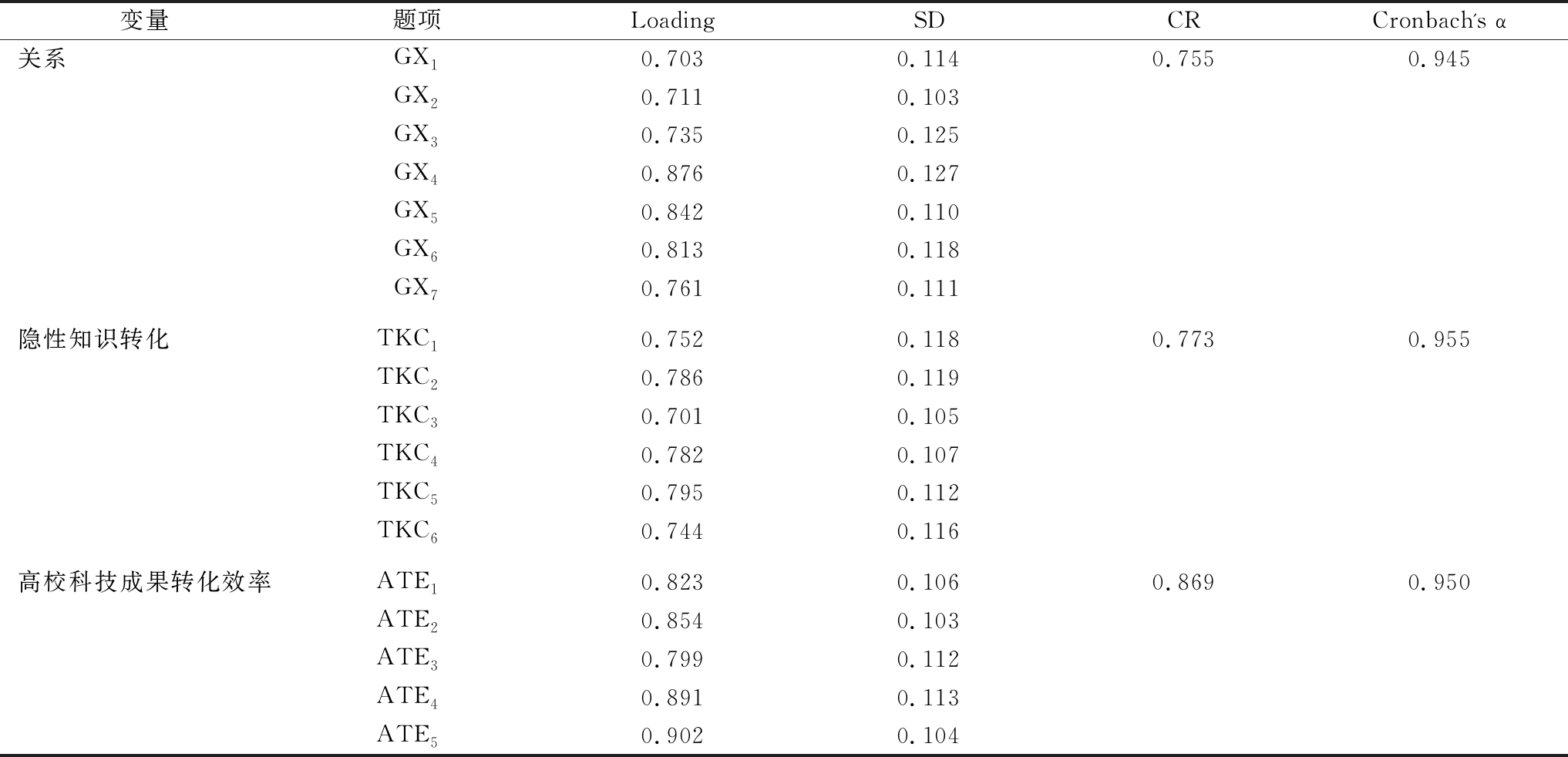变量题项LoadingSDCRCronbach's α关系 GX10.7030.1140.7550.945GX20.7110.103GX30.7350.125GX40.8760.127GX50.8420.110GX60.8130.118GX70.7610.111隐性知识转化TKC10.7520.1180.7730.955TKC20.7860.119TKC30.7010.105TKC40.7820.107TKC50.7950.112TKC60.7440.116高校科技成果转化效率ATE10.8230.1060.8690.950ATE20.8540.103ATE30.7990.112ATE40.8910.113ATE50.9020.104