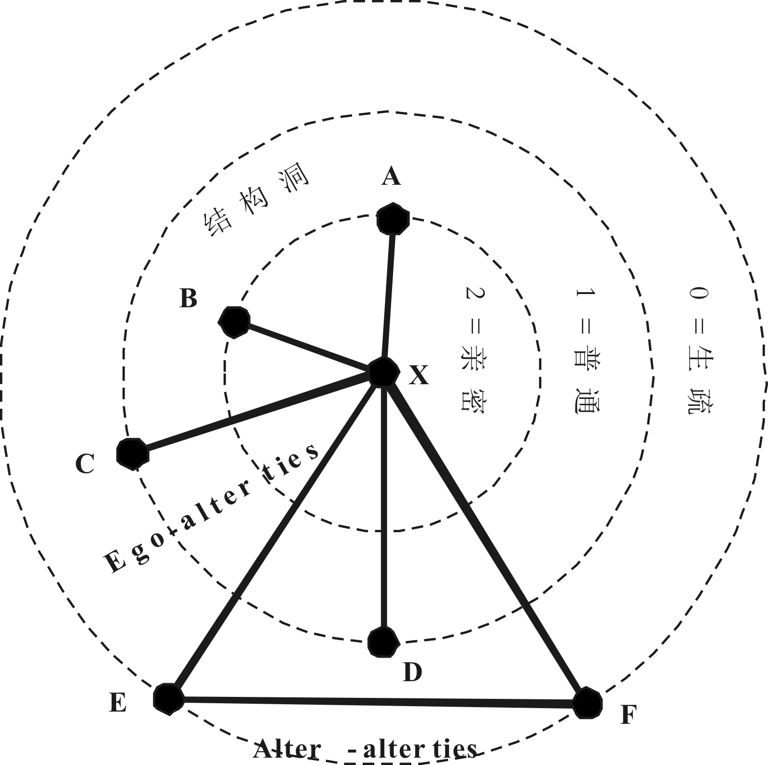 具体地,本研究要求受访者回答8个问题,即高校科技成果供给信息发布(A)、高校科技成果需求信息发布(B)、高校科技成果转化中的法律保障(C)、高校科技成果转化中的政策指导(D)、高校科技成果转化中的资金支持(E)、高校科技成果转化中的仲裁服务(F)、高校科技成果转化中的价格测评(G)、高校科技成果转化中的产权保护(H)。代表问题如“在高校科技成果转化过程中,当涉及到知识产权纠纷时,你通常会寻求谁的帮助?”针对每个问题,本研究要求受访者最多列出3个名字,然后将所有列出的名字放到一起,构建出受访者的高校科技成果转化团队关系网络。本研究在0~2范围的基础上测量关系强度(2=亲密; 1=普通; 0=生疏)。最后,本研究使用Burt[5]的约束c (constraint)测量结构洞。受访者X的高校科技成果转化团队关系网络如图3所示。