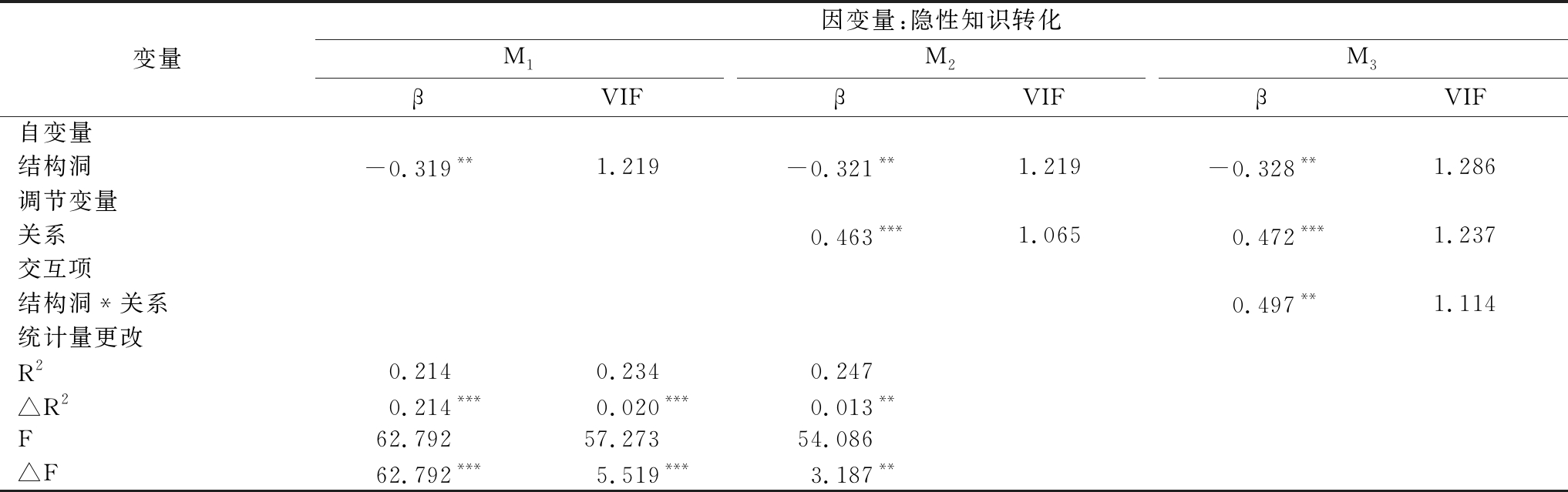 变量因变量:隐性知识转化M1βVIFM2βVIFM3βVIF自变量结构洞-0.319**1.219-0.321**1.219-0.328**1.286调节变量关系0.463***1.0650.472***1.237交互项结构洞*关系0.497**1.114统计量更改R20.2140.2340.247△R20.214***0.020***0.013**F62.79257.27354.086△F62.792***5.519***3.187**