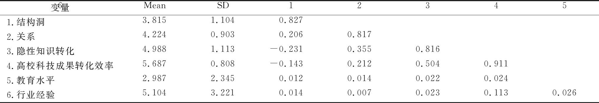 变量MeanSD1234561.结构洞3.8151.1040.8272.关系4.2240.9030.2060.8173.隐性知识转化4.9881.113-0.2310.3550.8164.高校科技成果转化效率5.6870.808-0.1430.2120.5040.9115.教育水平2.9872.3450.0120.0140.0220.0246.行业经验5.1043.2210.0140.0070.0230.1130.026