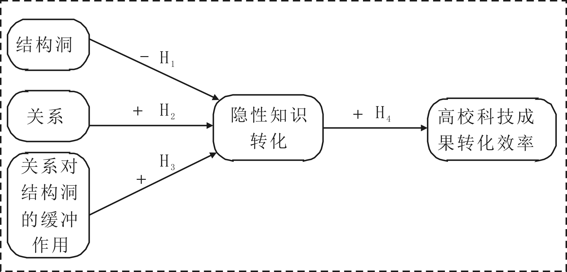 随着关系的搭建和培养,结构洞占据者愿意填充其拥有的结构洞,将两边的“局外人”变成“圈内人”,使丰富的创新资源以恩惠交换、人情往来和面子维护形式围绕着圈子流通[8]。在此情景下,高校科技成果转化团队变成一个具有外延扩张潜力的关系网,关系网内成员可以接触到更多“牛人”。同时,为资源和人才牵线搭桥也能够加深团队成员间的信任[9]。本研究透过关系填充结构洞视角,阐释高校科技成果转化的隐性知识转化。具体研究问题如下:结构洞和关系如何影响高校科技成果转化团队成员间的隐性知识转化?关系是否能够缓解结构洞的负面影响?促进隐性知识转化是否能够提升高校科技成果转化效率?