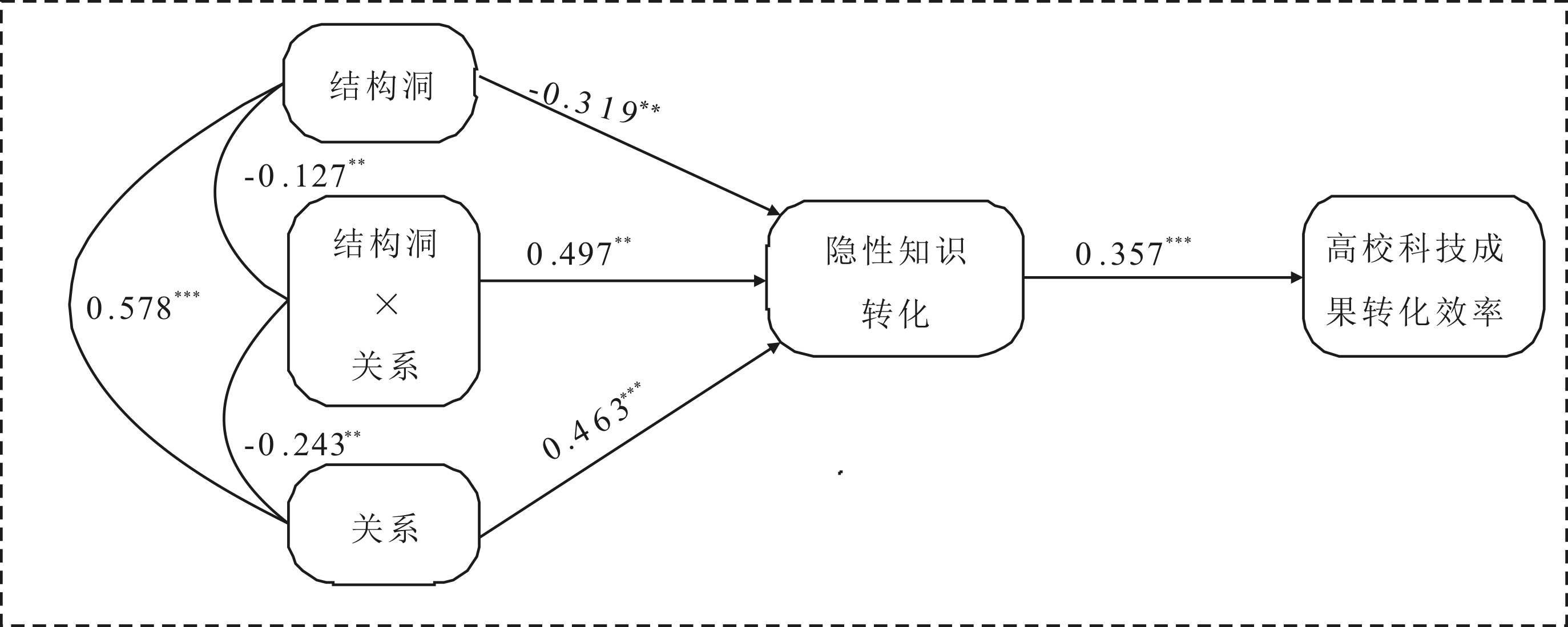 H3:关系会缓解结构洞的阻碍作用,进而促进隐性知识转化。