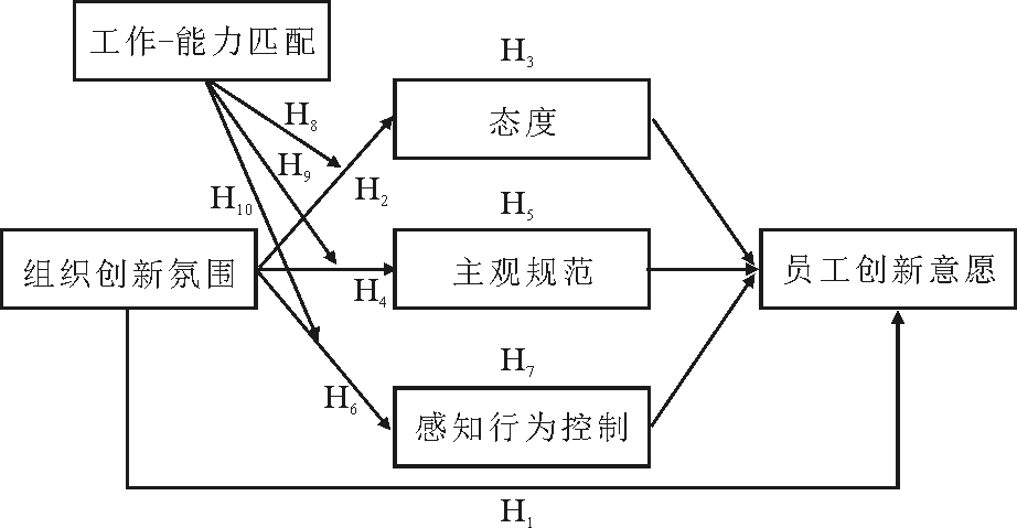 计划行为理论是从信息加工角度、以期望价值理论为出发点,解释个体行为一般决策过程的经典理论之一,被认为能够显著解释并预测个体行为意愿[8]。该理论将多种影响个体行为意愿的因素综合归纳为态度、主观规范和感知行为控制3个方面,为个体行为意愿提供了良好的研究框架。大量现有研究证实,计划行为理论对解释与预测创业意愿、员工行为、消费选择[9]等众多个体行为的有效性。但从检索到的国内外现有文献看,该理论在创新管理领域的应用较为匮乏,具体到服务创新领域的研究更是寥寥无几。基于此,本研究从计划行为理论出发,探讨组织创新氛围对员工创新意愿的作用机制。进一步地,考虑到知识型员工创新意愿受其知识技能水平的直接影响,因此引入工作—能力匹配作为调节变量。工作—能力匹配是指组织工作要求与员工自身能力水平的匹配程度。较高的工作—能力匹配度不仅能强化员工角色内行为,还能促进员工角色外行为[10]。也就是说,员工具备的领域相关知识技术水平越高,越容易受到组织创新氛围的鼓舞,进而凭借其对组织工作流程的精准把握与理解展现出更强烈的创新意愿。因此,探讨员工工作—能力匹配程度,对于厘清如何最大程度发挥组织创新氛围的积极作用具有重要意义。