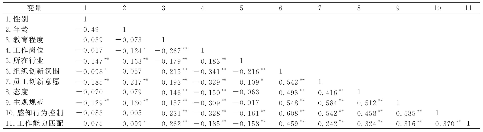 变量12345678910111.性别12.年龄-0.4913.教育程度0.039-0.07314.工作岗位-0.017-0.124*-0.267**15.所在行业-0.147**0.163**-0.179**0.183**16.组织创新氛围-0.098*0.0570.215**-0.341**-0.216**17.员工创新意愿-0.185**0.217**0.193**-0.329**0.109*0.542**18.态度-0.0700.0790.146**-0.150**-0.0630.493**0.416**19.主观规范-0.129**0.130**0.157**-0.309**-0.0170.548**0.584**0.512**110.感知行为控制-0.0830.0050.231**-0.328**-0.161**0.608**0.542**0.458**0.585**111.工作能力匹配0.0750.099*0.262**-0.185**-0.158**0.459**0.242**0.324**0.316**0.370**1