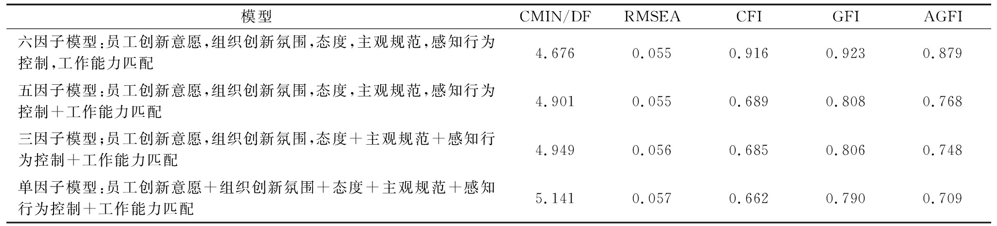 使用Amos 21.0对组织创新氛围、员工创新意愿、态度、主观规范、感知行为控制、工作能力匹配等6个变量之间的区别效度进行验证性因子分析,结果见表1。对比六因子模型、五因子模型、三因子模型和单因子模型的模型拟合度指标,发现六因子模型明显具有更为优异的模型拟合度(卡方值自由度比为4.676,小于临界值5;RMSEA为0.055,小于临界值0.08;其余检验指标GFI为0.923,AGFI为0.879,IFI为0.820,CFI为0.916,均达到或接近临界值0.9),证明本研究所选变量具有良好的区别效度。