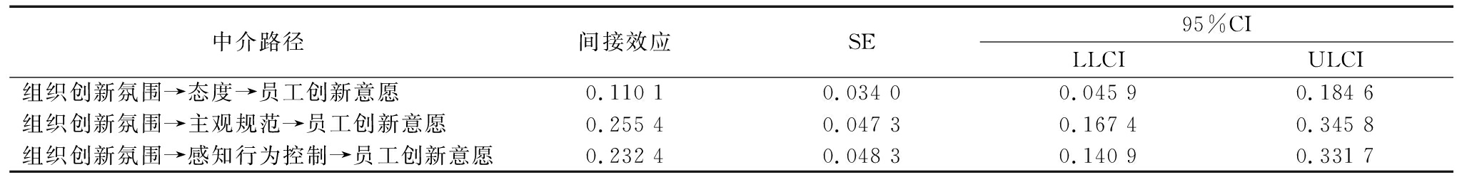 其次,对组织创新氛围与员工创新意愿间的3条中介路径进行检验。在检验多重中介效应时,Amos只能得到总的中介效应估计值,而无法给出每条特定中介路径的中介效应分析结果。大量实证研究结果表明,若要分析每条路径的特定中介效应,可以使用Bootstrap区间法。因此,本研究参考Hayes[41]提出的Bootstrap中介效应检验法,设置在95%的置信区间下进行5 000次抽样,若该水平下间接效应的Bias-corrected置信区间(CI)不包含0,则表示存在中介效应,检验结果如表4所示。在组织创新氛围和员工创新意愿关系间,基于态度(BC 95%,CI=[0.045 9,0.184 6])、主观规范(BC 95%,CI=[0.167 4,0.345 8])和感知行为控制(BC 95%,CI=[0.140 9,0.331 7])的中介效应都显著,即组织创新氛围能够通过态度影响员工创新意愿,假设H3成立;组织创新氛围能够通过主观规范影响员工创新意愿,假设H5成立;组织创新氛围能够通过感知行为控制影响员工创新意愿,假设H7成立。