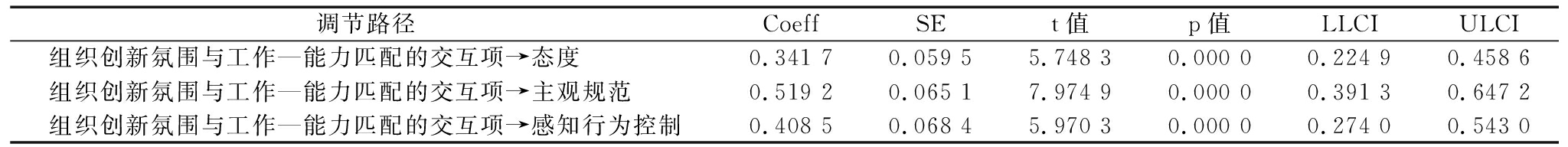 最后,参考Hayes提出的Bootstrap置信区间法,将中介和调节效应纳入同一分析框架进行整合,以分别验证工作—能力匹配对组织创新氛围—态度—员工创新意愿、组织创新氛围—主观规范—员工创新意愿、组织创新氛围—感知行为控制—员工创新意愿3条间接路径的调节作用。由表5可知,工作—能力匹配在组织创新氛围与态度间具有显著的正向调节作用(0.224 9,0.458 6),作用值为0.341 7,假设H8成立;工作—能力匹配在组织创新氛围与主观规范间具有显著的正向调节作用(0.391 3,0.647 2),作用值为0.519 2,假设H9成立;工作—能力匹配在组织创新氛围与感知行为控制间具有显著的正向调节作用(0.274 0,0.543 0),作用值为0.408 5,假设H10成立。这些表明员工个人能力与其工作的匹配度越高,态度、主观规范和感知行为控制在组织创新氛围与员工创新意愿之间的中介作用越显著。