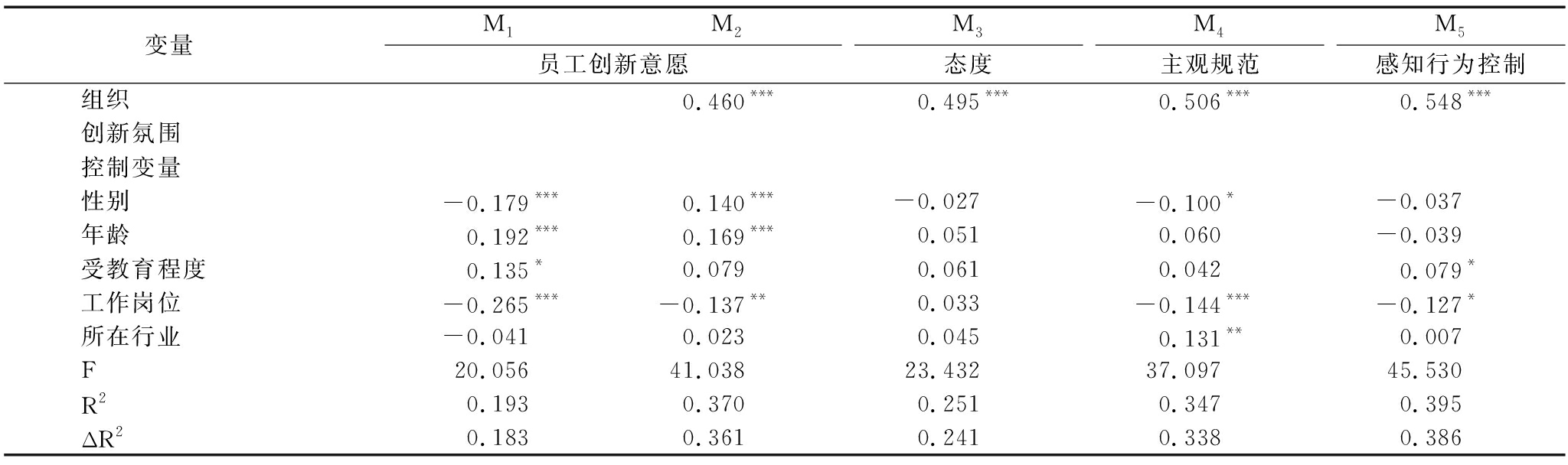 表3 组织创新氛围、态度、主观规范、感知行为控制、员工创新意愿直接影响关系的回归检验结果