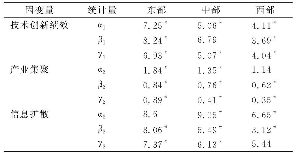 因变量统计量东部中部西部技术创新绩效α17.25*5.06*4.11*β18.24*6.793.69*γ16.93*5.07*4.04*产业集聚 α21.84*1.35*1.14β20.84*0.76*0.62*γ20.89*0.41*0.35*信息扩散 α38.69.05*6.65*β38.06*5.49*3.12*γ37.37*6.13*5.44