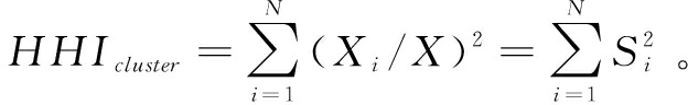 为空间Gini指数,Hcluster为Herfindahl指数,si为第i个区域的产业就业百分比,xi为第i个区域的所有就业人数与经济体总就业人数的比率。
