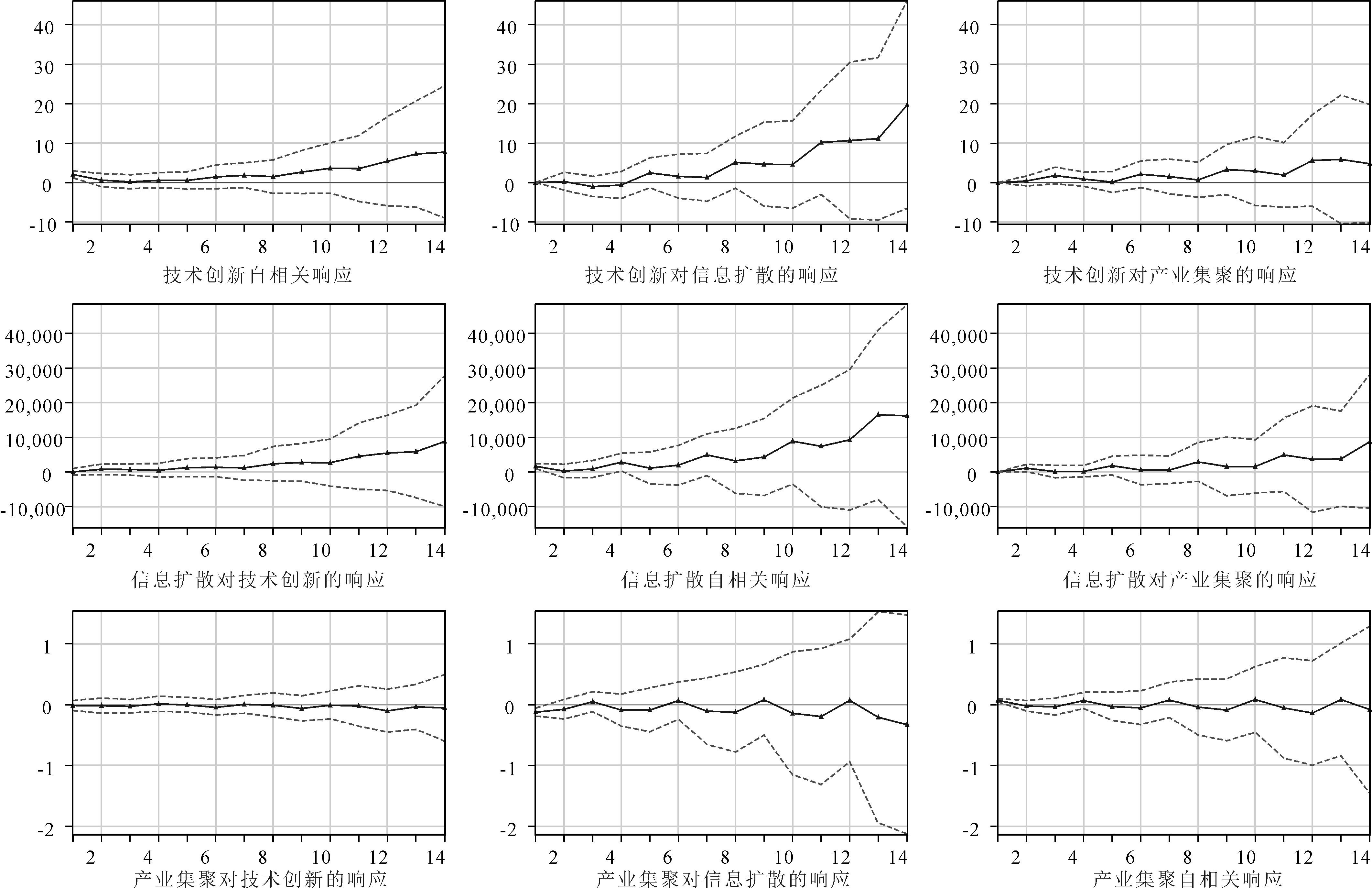 在此基础上,对VAR模型中的信息扩散、产业集聚以及技术创新绩效间的脉冲响应(IRF)进行分析。其脉冲响应结构如下: