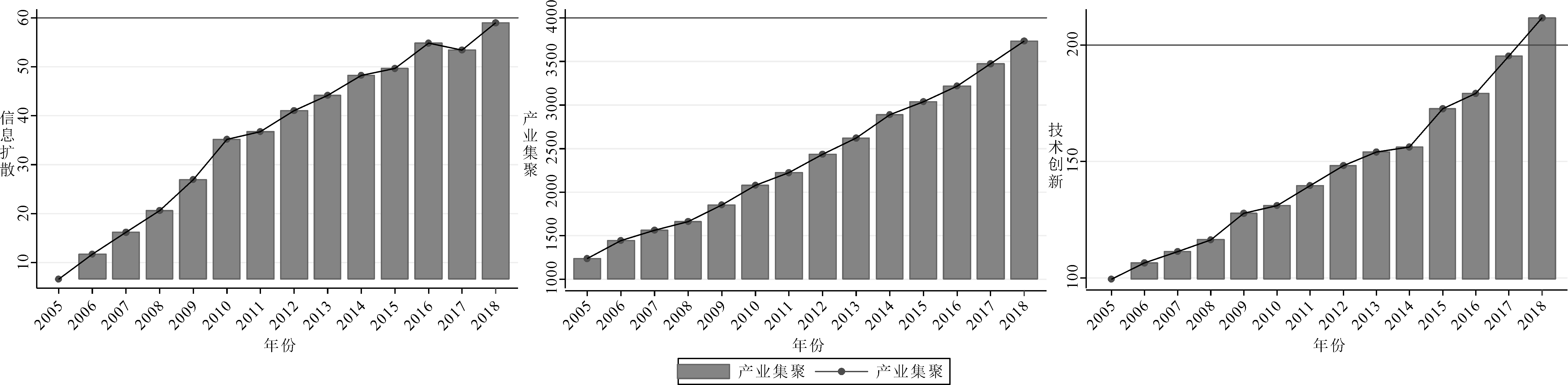 通过采用VAR模型、面板数据模型及状态空间模型,结合2005-2018年面板数据,探究信息扩散、产业集聚以及技术创新绩效间的动态影响,得出如下研究结论: