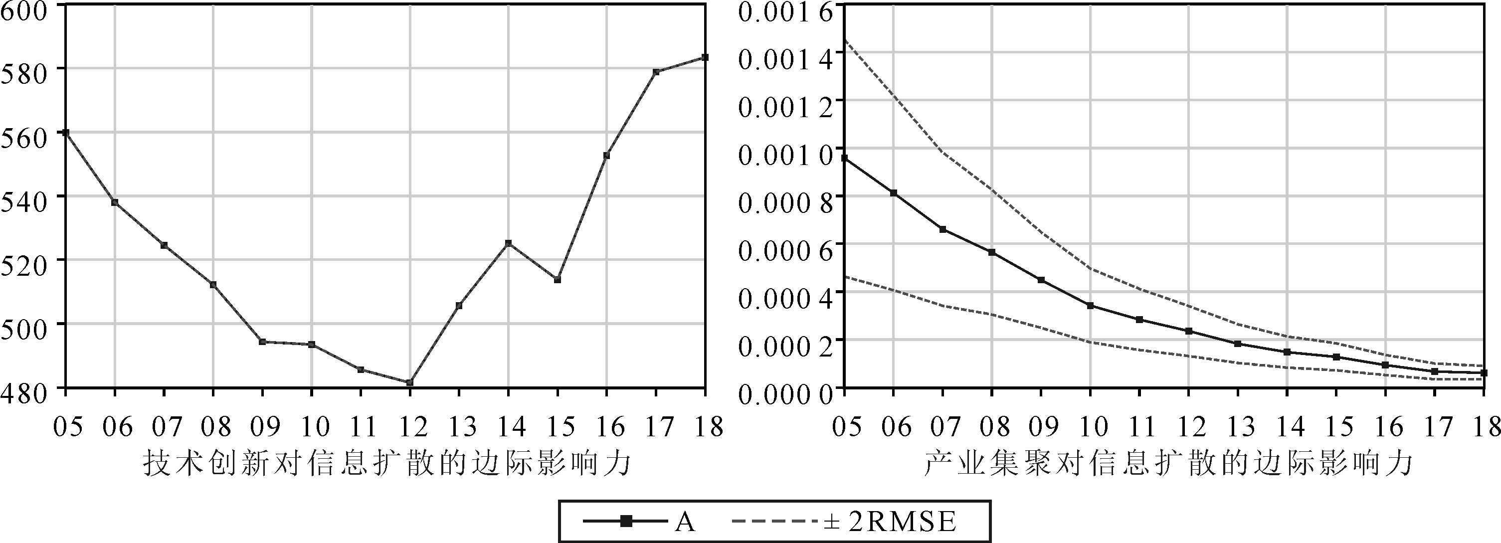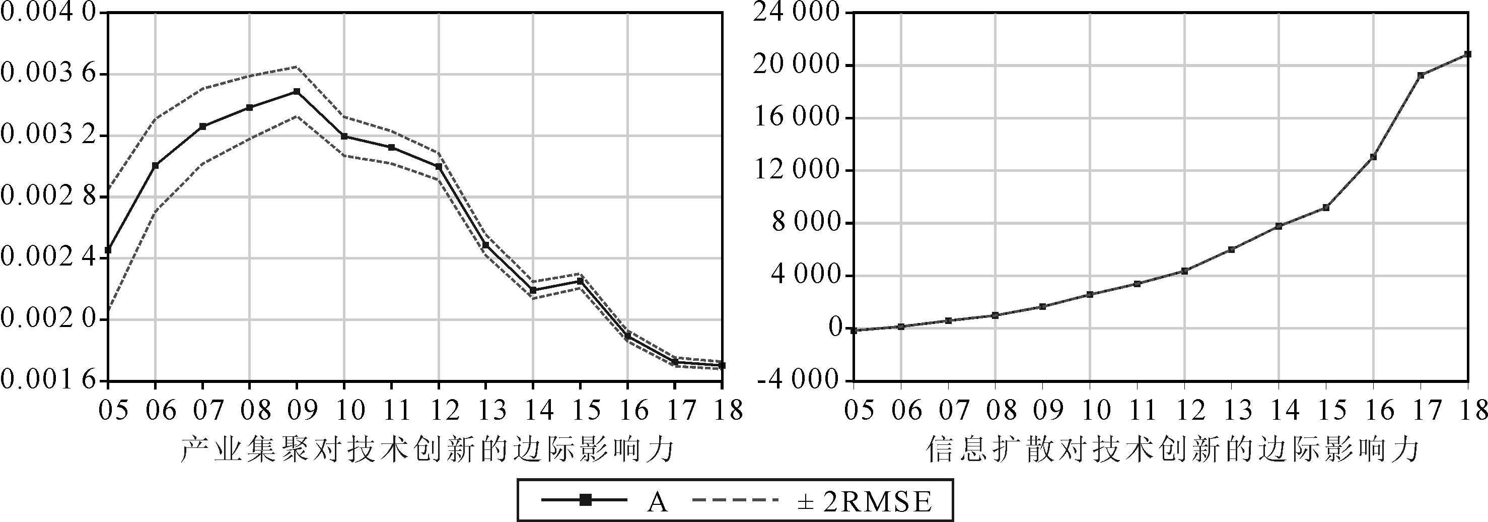 图4显示,产业集聚对创新绩效的边际影响力呈倒U形抛物线,即在2005-2009年呈递增趋势,在2009年达到最大值,其后呈缓慢递减趋势。信息扩散对技术创新绩效的边际影响力在2005-2018年呈递增趋势且表现显著。