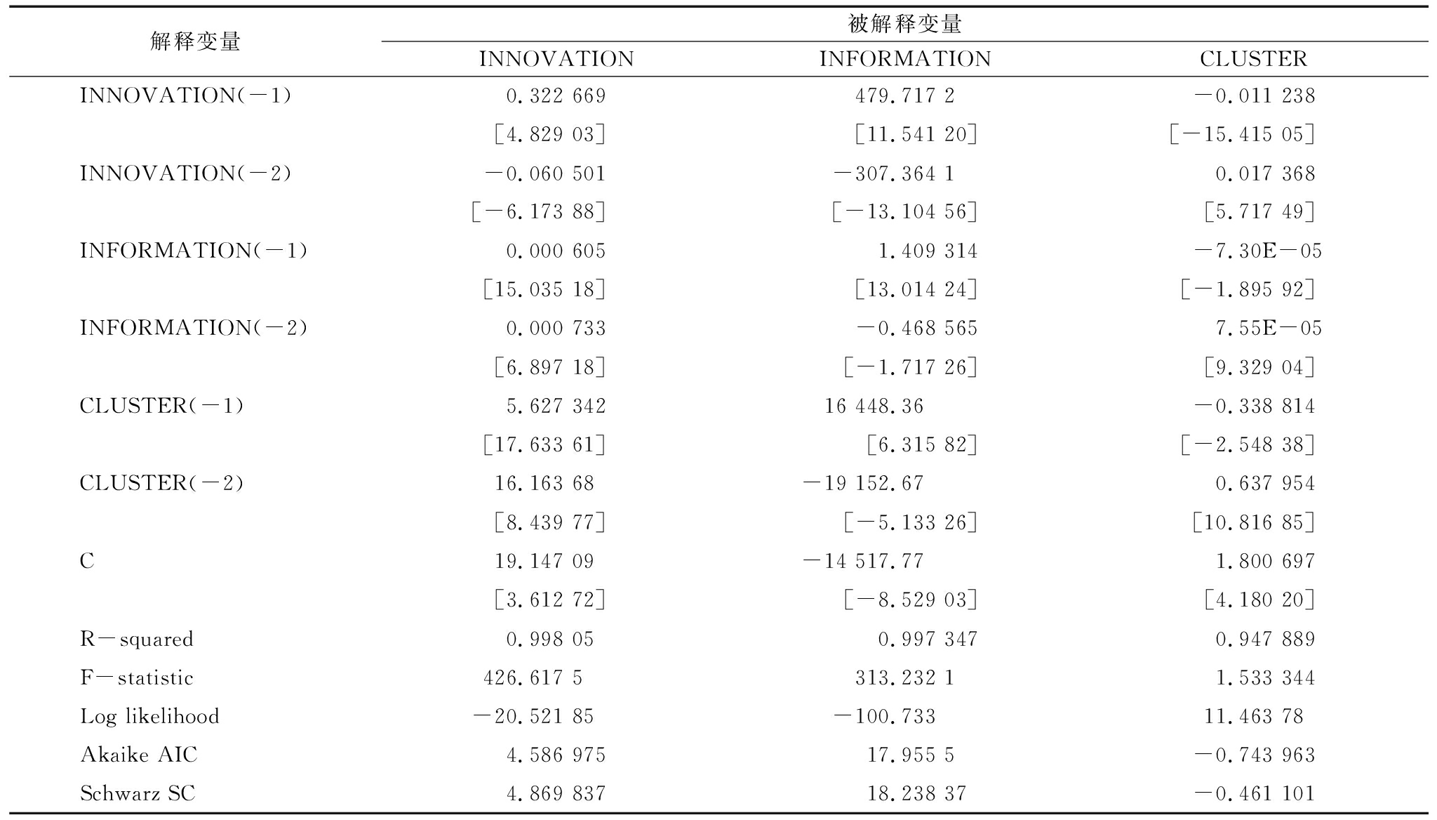 解释变量被解释变量INNOVATIONINFORMATIONCLUSTERINNOVATION(-1)0.322 669479.717 2-0.011 238[4.829 03][11.541 20][-15.415 05]INNOVATION(-2)-0.060 501-307.364 10.017 368[-6.173 88][-13.104 56][5.717 49]INFORMATION(-1)0.000 6051.409 314-7.30E-05[15.035 18][13.014 24][-1.895 92]INFORMATION(-2)0.000 733-0.468 5657.55E-05[6.897 18][-1.717 26][9.329 04]CLUSTER(-1)5.627 34216 448.36-0.338 814[17.633 61][6.315 82][-2.548 38]CLUSTER(-2)16.163 68-19 152.670.637 954[8.439 77][-5.133 26][10.816 85]C19.147 09-14 517.771.800 697[3.612 72][-8.529 03][4.180 20]R-squared0.998 050.997 3470.947 889F-statistic426.617 5313.232 11.533 344Log likelihood-20.521 85-100.73311.463 78Akaike AIC4.586 97517.955 5-0.743 963Schwarz SC4.869 83718.238 37-0.461 101