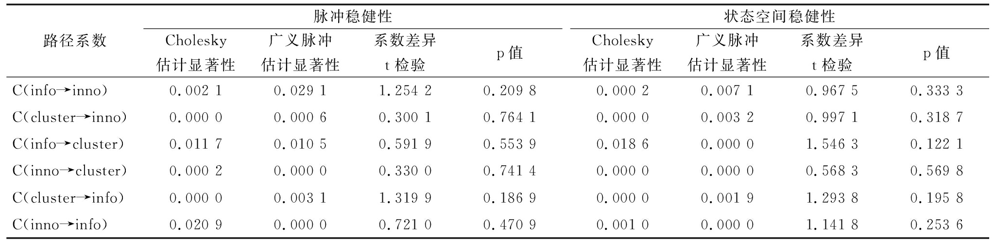 路径系数脉冲稳健性Cholesky估计显著性广义脉冲估计显著性系数差异t检验p值状态空间稳健性Cholesky估计显著性广义脉冲估计显著性系数差异t检验p值C(info→inno)0.002 10.029 11.254 20.209 80.000 20.007 10.967 50.333 3C(cluster→inno)0.000 00.000 60.300 10.764 10.000 00.003 20.997 10.318 7C(info→cluster)0.011 70.010 50.591 90.553 90.018 60.000 01.546 30.122 1C(inno→cluster)0.000 20.000 00.330 00.741 40.000 00.000 00.568 30.569 8C(cluster→info)0.000 00.003 11.319 90.186 90.000 00.001 91.293 80.195 8C(inno→info)0.020 90.000 00.721 00.470 90.001 00.000 01.141 80.253 6